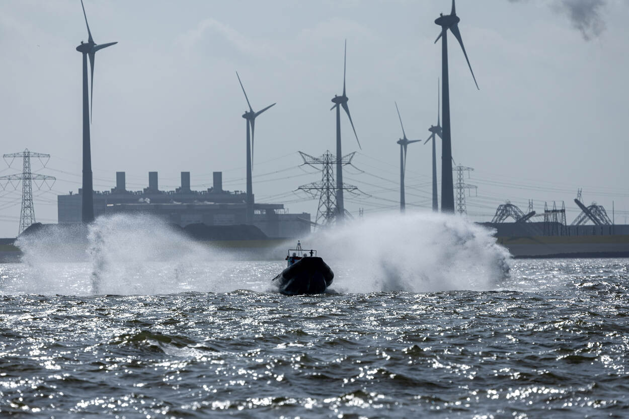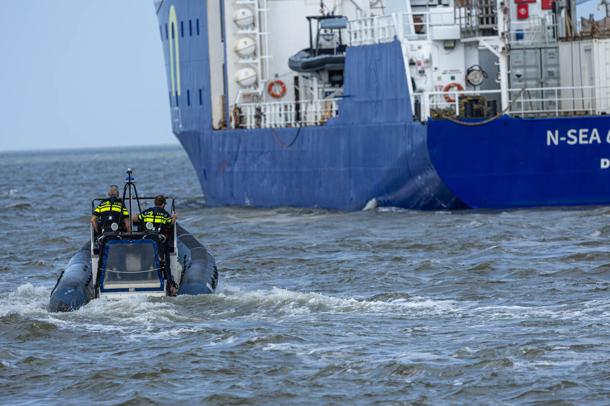 Een marinebootje en de politie stomen op naar het verdachte schip, de GeoSea.