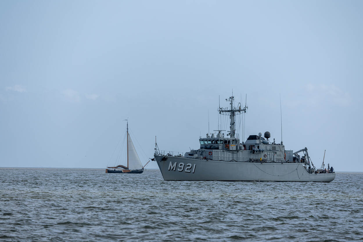 Op volle zee bij Scheveningen varen drie mijnenbestrijdingsvaartuigen achter elkaar.