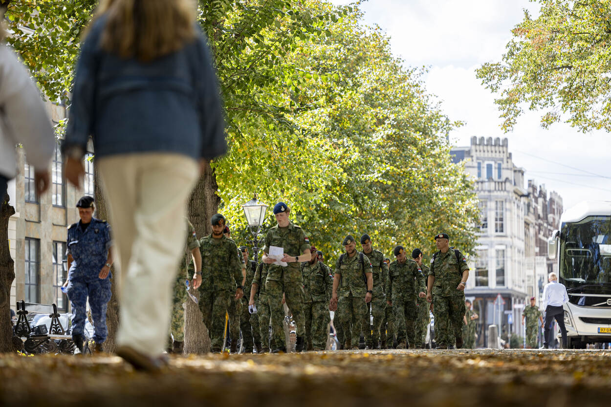 Tweede luitenant Stan en opperwachtmeester Youri stappen uit de bus, wandelen een stukje en kijken om zich heen. Samen met enkele tientallen collega’s staan ze midden in Den Haag, op het Lange Voorhout. De verkleurde bladeren op de grond verraden dat de meteorologische herfst inmiddels is ingezet. Op de brede laan wemelt het deze dag van scholieren en toeristen, maar over enkele dagen treft het duo een heel ander decor. Dan is dit stukje van de stad onderdeel van de route die de koninklijke stoet aflegt tussen Paleis Noordeinde en de Koninklijke Schouwburg.