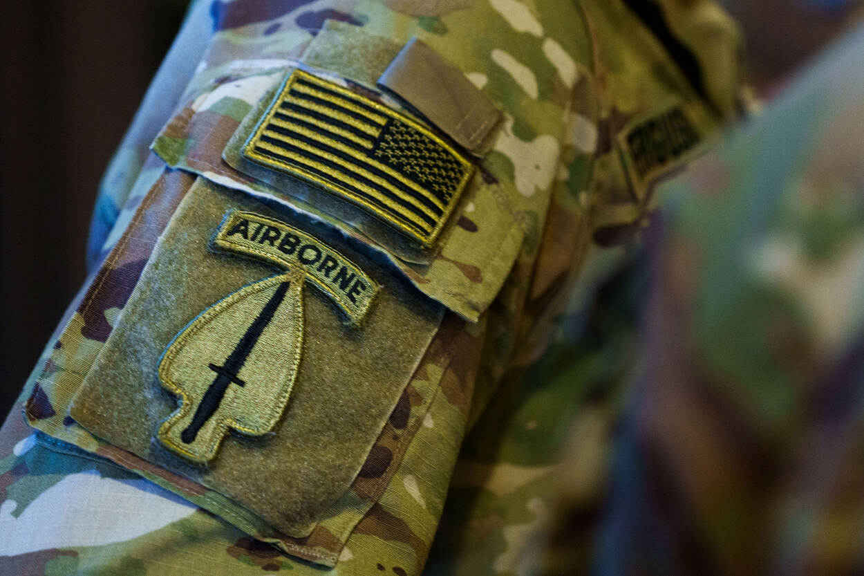 Viermaal een mouw van een militair uniform met daarop de vlaggen en logo’s van respectievelijk Nederland, de Verenigde Staten, het Verenigd Koninkrijk en Polen.