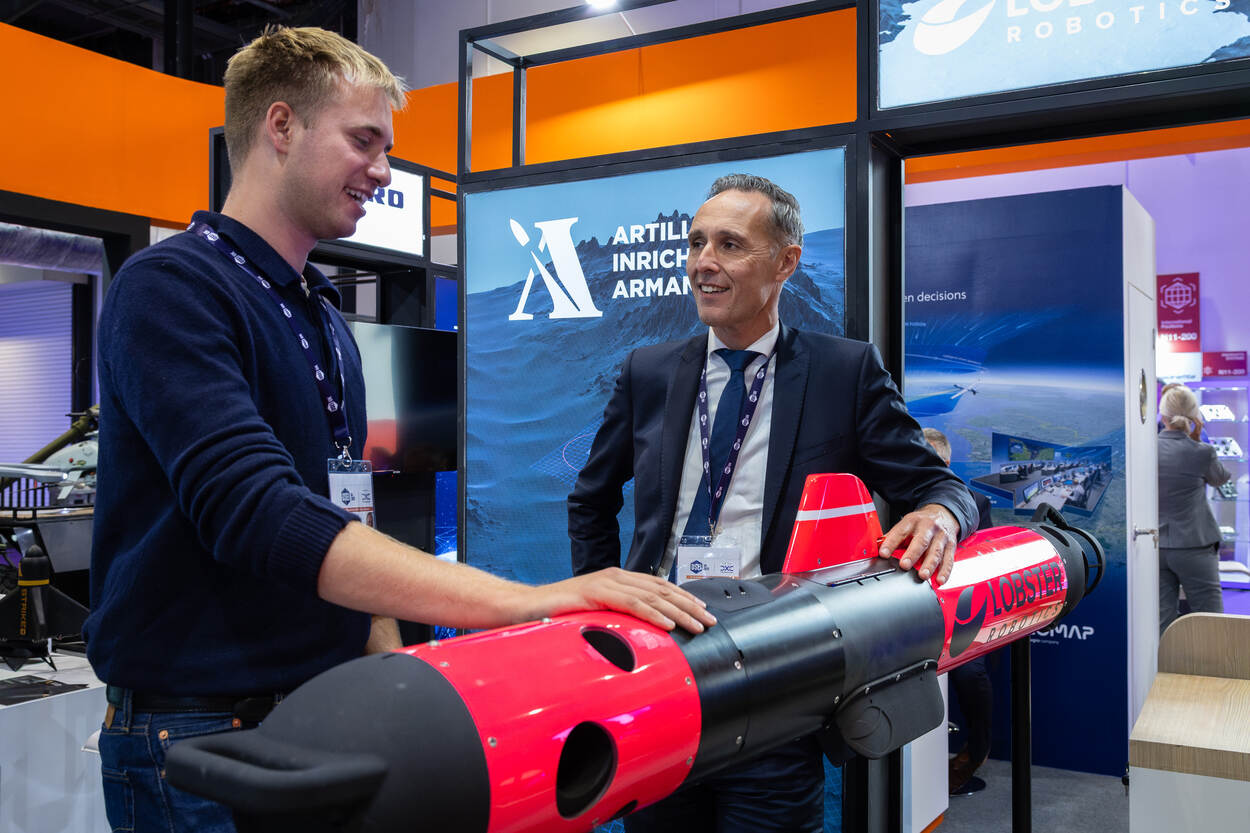 Lobster Robotics valt in zowel de tweede als laatste categorie. Het Delftse bedrijf trekt in het oranje gekleurde paviljoen direct de aandacht met de felroze Scout 3. “Deze onderwaterdrone maakt haarscherp zichtbaar wat er onder water gebeurt”, legt medeoprichter en CEO Stephan Rutten uit. Dat is niet alleen van waarde voor de bescherming van maritieme ecosystemen, maar ook voor de beveiliging van onderwaterinfrastructuur. Het is een uitvinding die dus zowel in de civiele als de Defensiewereld valt in te zetten; het zogenoemde dual use.