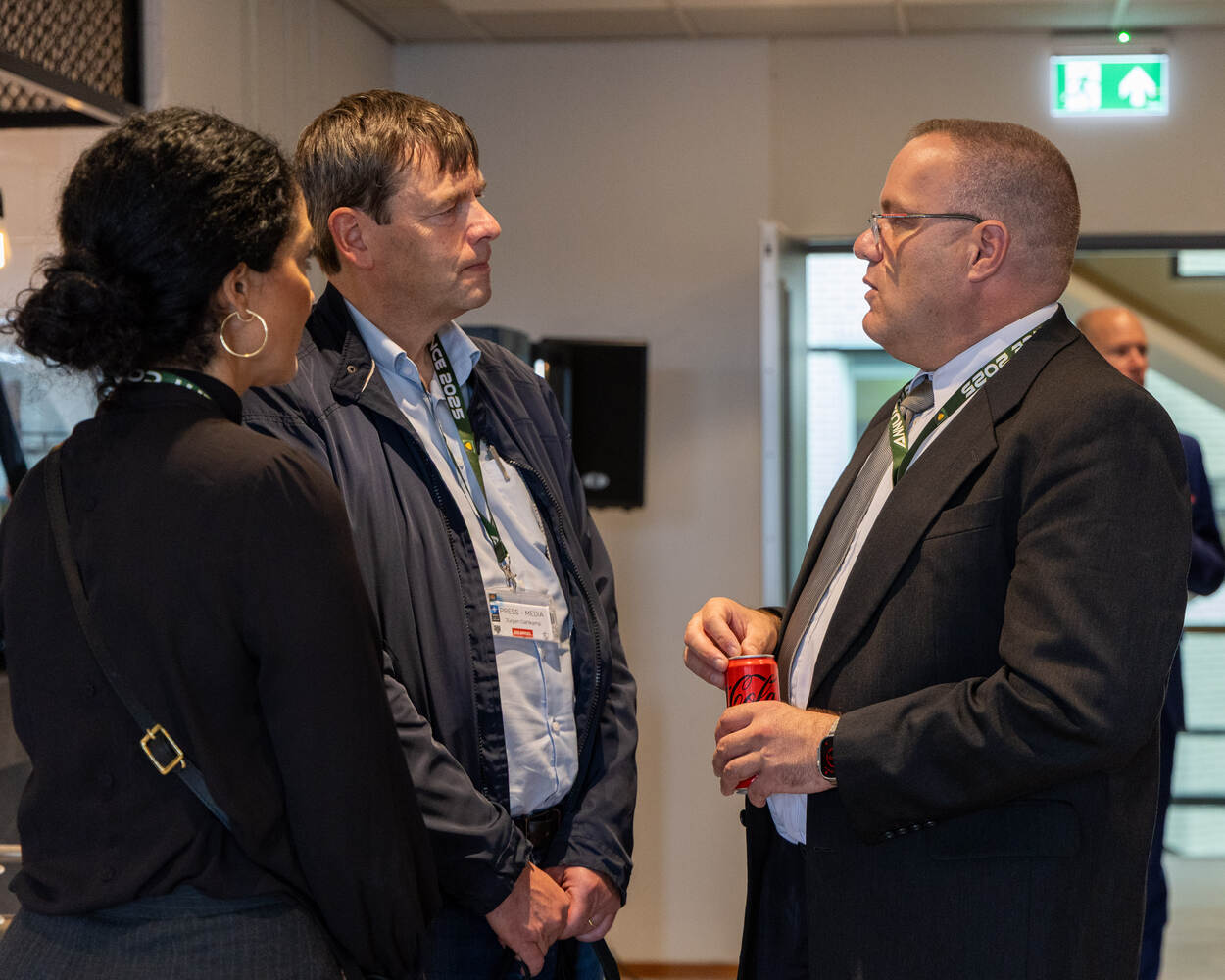 Kolonel Paape (m) in gesprek met 2 bezoekers van de conferentie.
