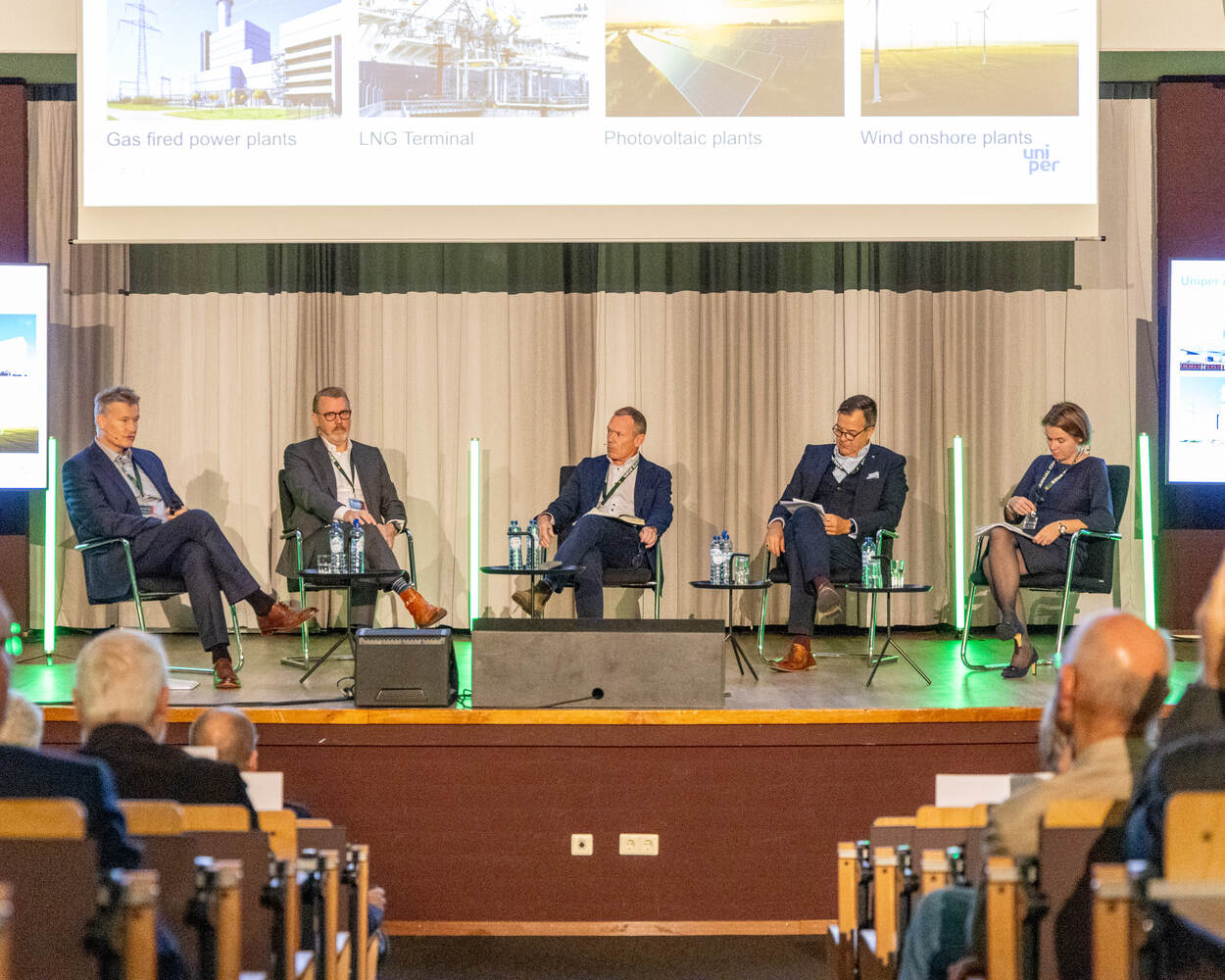 5 personen praten met elkaar op een podium met gordijnen en videobeelden op achtergrond.