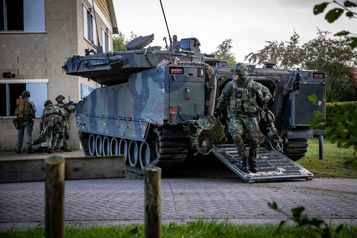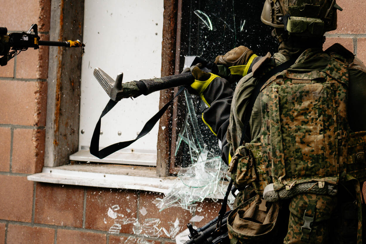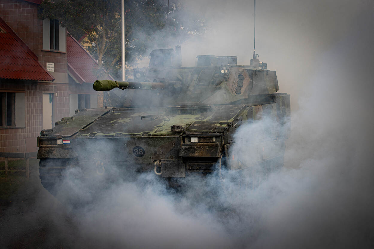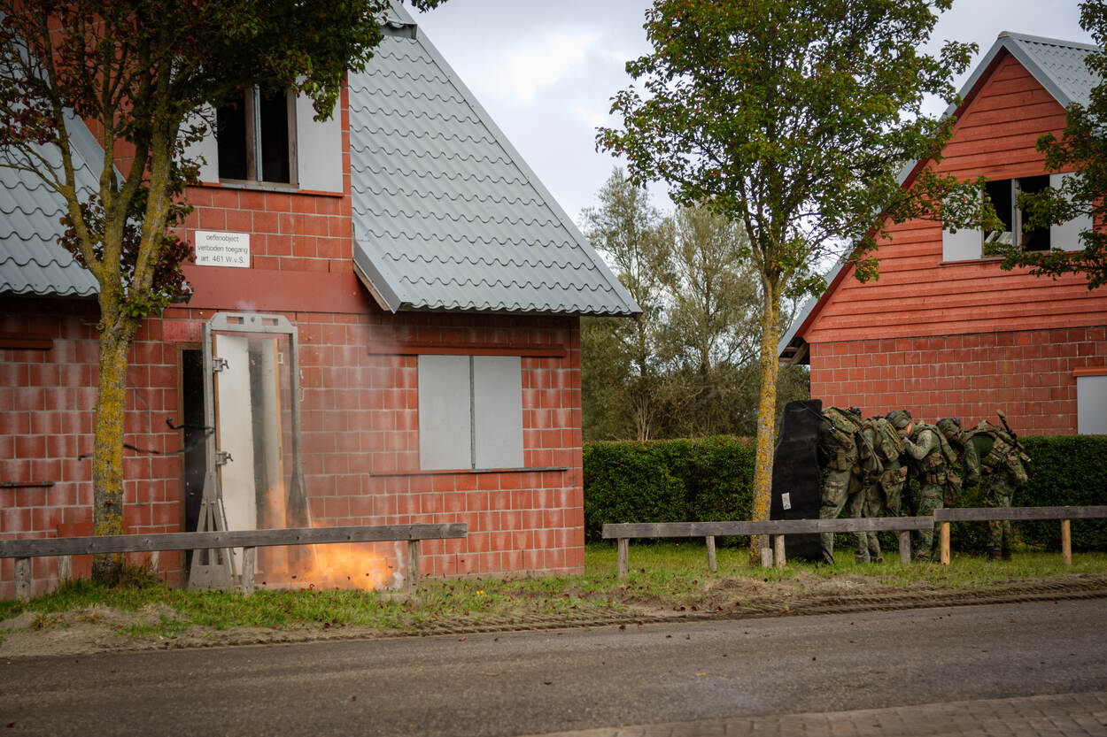 Opgepast! Wie deze CV90 (Combat Vehicle 90) op zich af ziet komen, doet vanzelf een stapje naar achteren. Met een maximumsnelheid van zeventig kilometer per uur is deze kolos sneller bij je dan je denkt. In dit infanteriegevechtsvoertuig passen naast de chauffeur, boordschutter en commandant nog eens zeven militairen. Na een paar keer ‘zagen’ - rap naar voren en achteren rijden om de vijand te verrassen en zelf zo veilig mogelijk te blijven - is het tijd om uit te stijgen. Infanteristen die achterin de bak zitten, verlaten zo snel mogelijk de CV90 om een pand in Marnehuizen te betrekken. Bij het uitstijgen is één ding heel belangrijk. Om veilig het pand te bereiken, moeten de infanteristen continu druk zetten op de vijand. Dat betekent dus: snel voorwaarts gaan, wapens richten en volop focus. Het liefst ongezien - en anders onder dekking verplaatsen - is een must. Zo is de kans op vijandelijk vuur incasseren het kleinst. Dat doen de pantserinfanteristen onder meer door een rookgordijn op te werpen. Letterlijk. Zo ziet een eventuele vijand pas op het allerlaatste moment waar ze zijn. We blijven even hangen in de gele rook. Het bestormen van een pand is één. Maar het betreden ervan is soms knap lastig. Gelukkig heeft de Bravo-compagnie pantsergenisten binnen de gelederen. Zij helpen op minder subtiele wijze toegang tot gebouwen te verkrijgen. Dichte deur? Geen probleem. Dan maar via het raam. Met een harde klap barst deze ruit in vele duizenden stukken en splinters. Tijdens dit zogenaamde ‘breachen’ staan de pantserinfanteristen stil en zijn ze dus kwetsbaar. Daarom letten collega’s continu op dreigingen van buitenaf. Bij het zuiveren van de panden zijn de militairen volledig op elkaar aangewezen. Van elke gang, elk kamertje en elk hoekje moeten ze zeker zijn dat daar geen vijand is. Optimale focus is daarom vereist. Om te voorkomen dat er slachtoffers vallen onder het uitgestegen personeel, blijft de CV90 in de buurt. En als er dan toch een gewonde valt, dan komt de CV90 goed van pas. Een pantserinfanterist helpt zijn collega met hoofdwond het gevechtsvoertuig in, zodat die snel naar geneeskundige troepen kan worden vervoerd. “3, 2, 1…” Een enorme klap met een flinke drukgolf in het kielzog klinkt door het oefendorp. Een dichte deur is niet bestand tegen de explosieve lading die de pantsergenie tot ontploffing brengt en breekt in tweeën. Het verrassingseffect speelt een grote rol bij het betreden van gebouwen en dat is hier aardig gelukt.