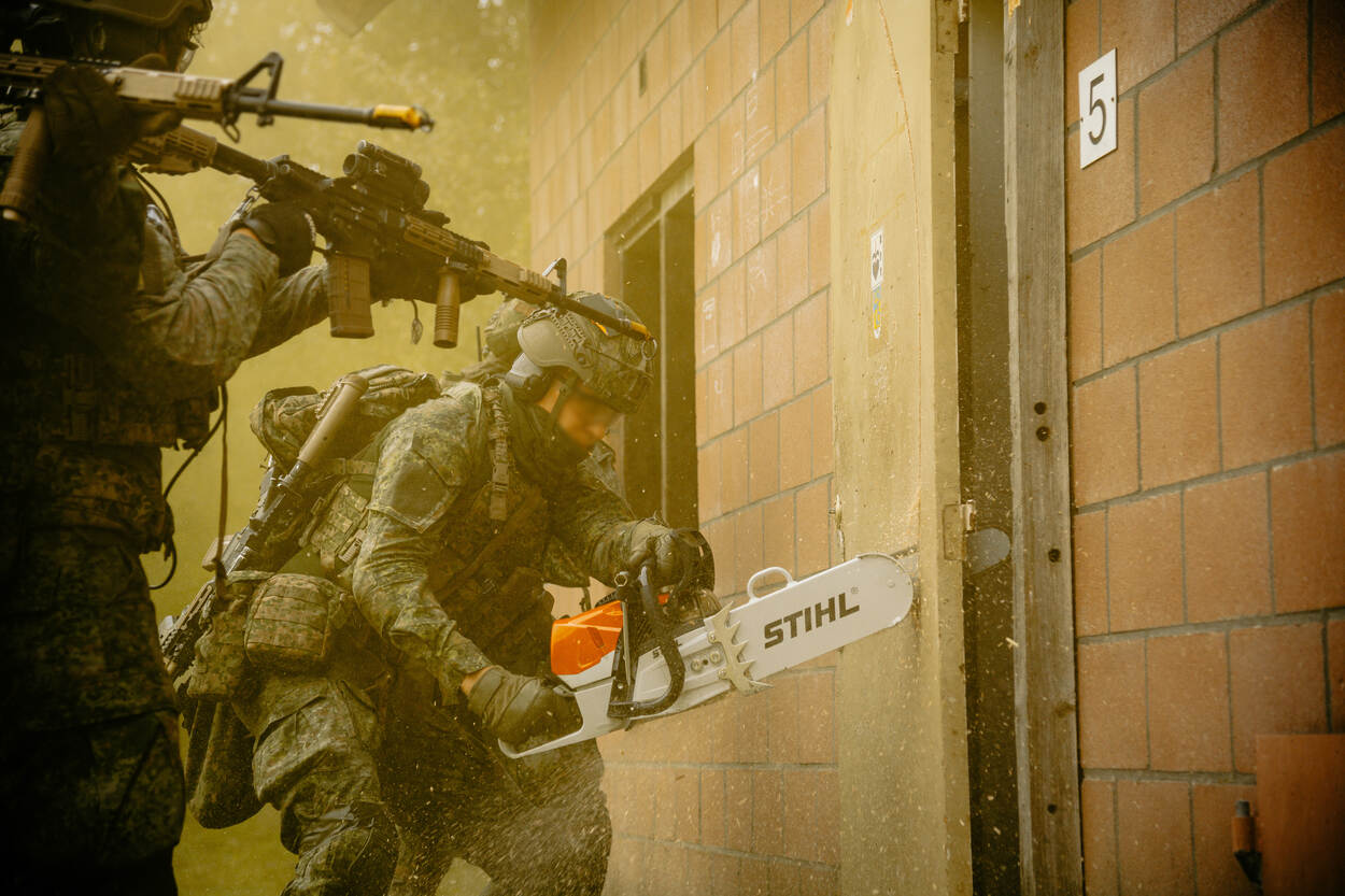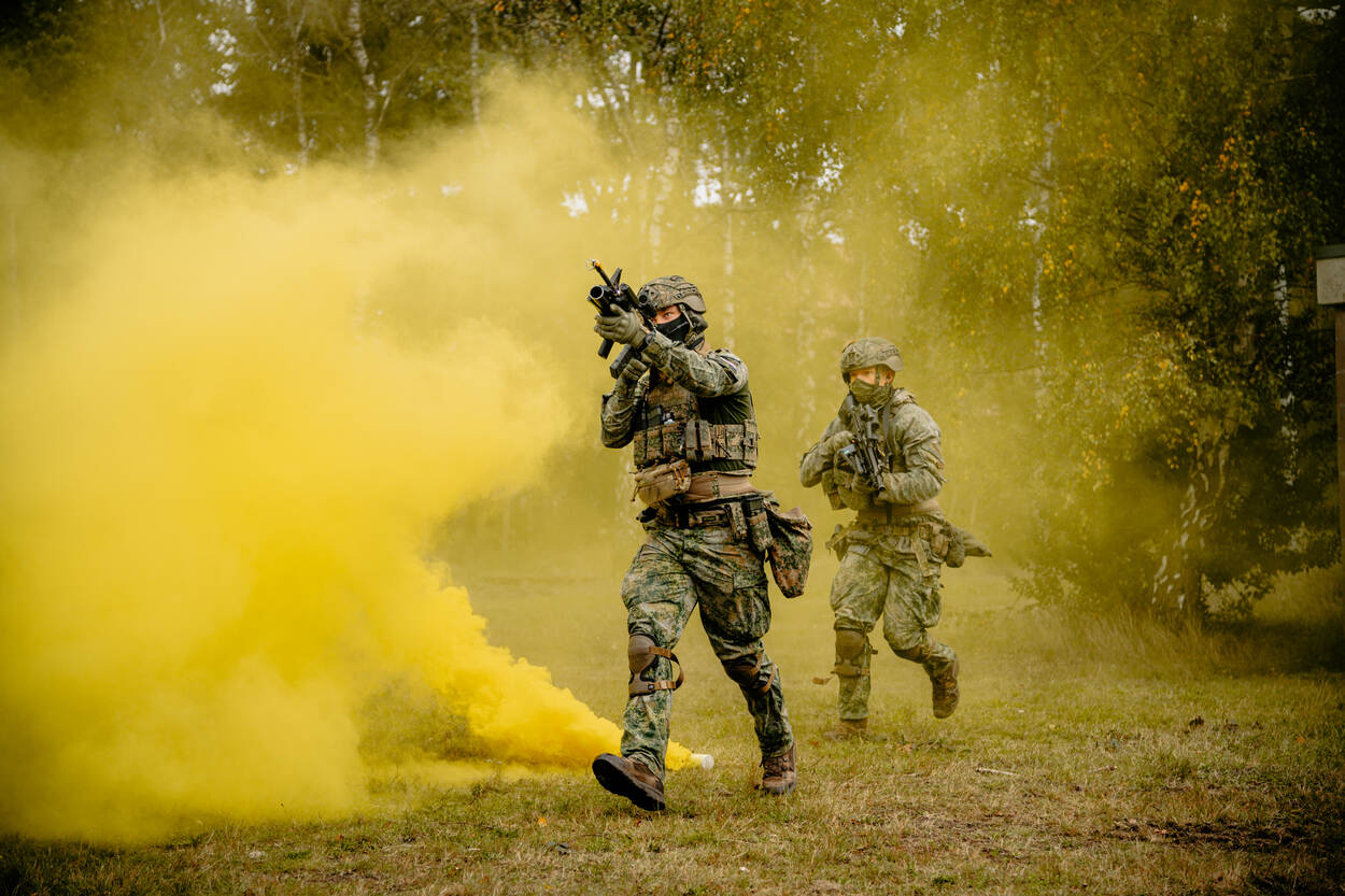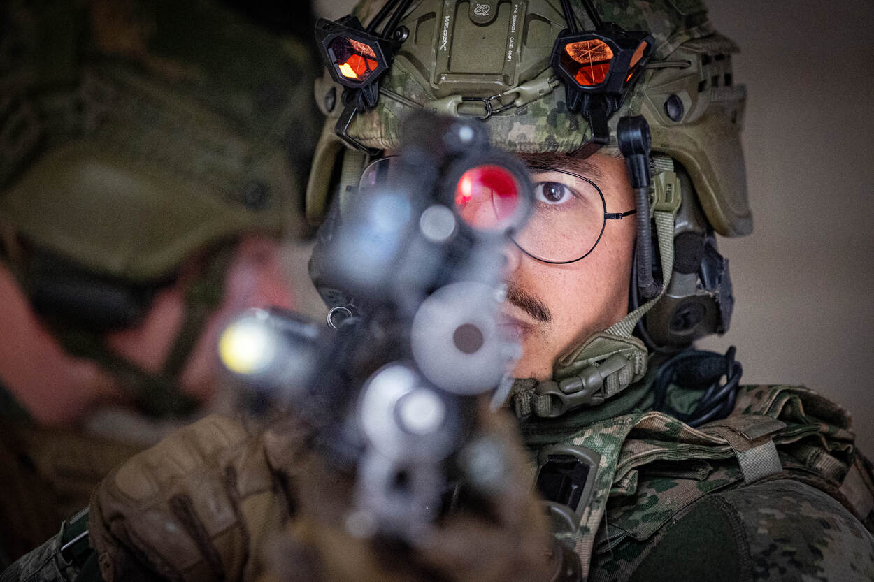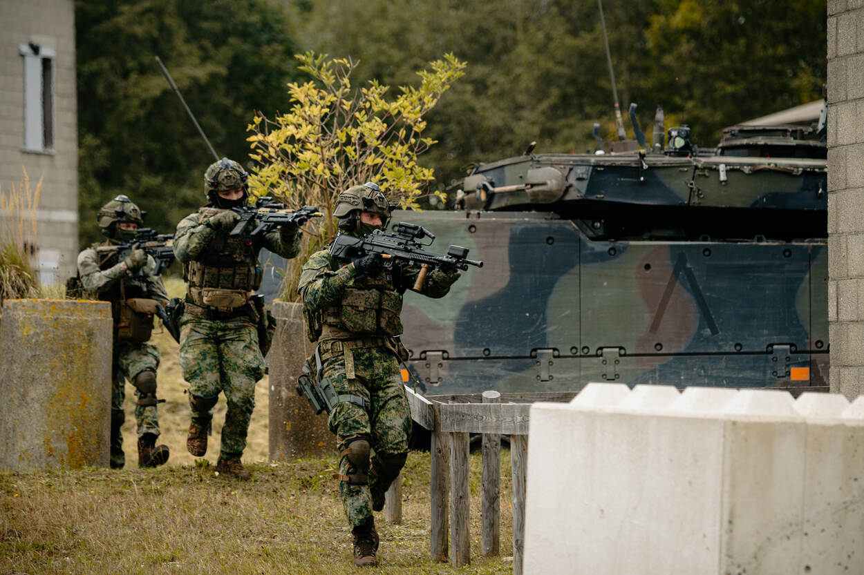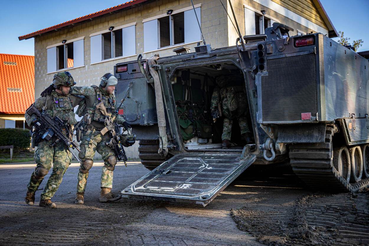 Opgepast! Wie deze CV90 (Combat Vehicle 90) op zich af ziet komen, doet vanzelf een stapje naar achteren. Met een maximumsnelheid van zeventig kilometer per uur is deze kolos sneller bij je dan je denkt. In dit infanteriegevechtsvoertuig passen naast de chauffeur, boordschutter en commandant nog eens zeven militairen. Na een paar keer ‘zagen’ - rap naar voren en achteren rijden om de vijand te verrassen en zelf zo veilig mogelijk te blijven - is het tijd om uit te stijgen. Infanteristen die achterin de bak zitten, verlaten zo snel mogelijk de CV90 om een pand in Marnehuizen te betrekken. Bij het uitstijgen is één ding heel belangrijk. Om veilig het pand te bereiken, moeten de infanteristen continu druk zetten op de vijand. Dat betekent dus: snel voorwaarts gaan, wapens richten en volop focus. Het liefst ongezien - en anders onder dekking verplaatsen - is een must. Zo is de kans op vijandelijk vuur incasseren het kleinst. Dat doen de pantserinfanteristen onder meer door een rookgordijn op te werpen. Letterlijk. Zo ziet een eventuele vijand pas op het allerlaatste moment waar ze zijn. We blijven even hangen in de gele rook. Het bestormen van een pand is één. Maar het betreden ervan is soms knap lastig. Gelukkig heeft de Bravo-compagnie pantsergenisten binnen de gelederen. Zij helpen op minder subtiele wijze toegang tot gebouwen te verkrijgen. Dichte deur? Geen probleem. Dan maar via het raam. Met een harde klap barst deze ruit in vele duizenden stukken en splinters. Tijdens dit zogenaamde ‘breachen’ staan de pantserinfanteristen stil en zijn ze dus kwetsbaar. Daarom letten collega’s continu op dreigingen van buitenaf. Bij het zuiveren van de panden zijn de militairen volledig op elkaar aangewezen. Van elke gang, elk kamertje en elk hoekje moeten ze zeker zijn dat daar geen vijand is. Optimale focus is daarom vereist. Om te voorkomen dat er slachtoffers vallen onder het uitgestegen personeel, blijft de CV90 in de buurt. En als er dan toch een gewonde valt, dan komt de CV90 goed van pas. Een pantserinfanterist helpt zijn collega met hoofdwond het gevechtsvoertuig in, zodat die snel naar geneeskundige troepen kan worden vervoerd. “3, 2, 1…” Een enorme klap met een flinke drukgolf in het kielzog klinkt door het oefendorp. Een dichte deur is niet bestand tegen de explosieve lading die de pantsergenie tot ontploffing brengt en breekt in tweeën. Het verrassingseffect speelt een grote rol bij het betreden van gebouwen en dat is hier aardig gelukt.