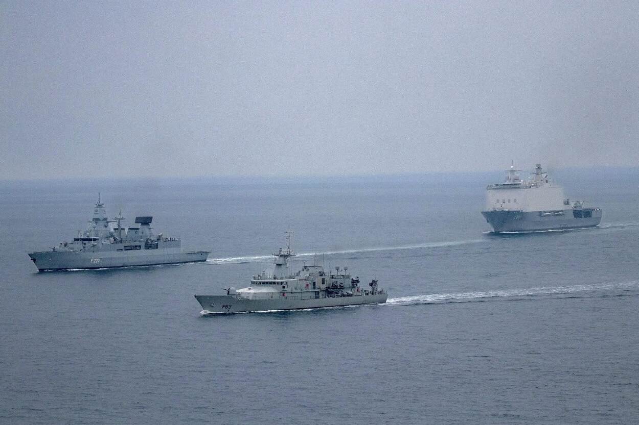 Het NAVO-vlaggenschip Zr.Ms. Johan de Witt, het Duitse fregat FGS Hamburg en het Irish Naval Service ocean patrol vessel, LÉ William Butler Yeats in een beeld gevangen. Dat levert altijd een fraaie plaat op.