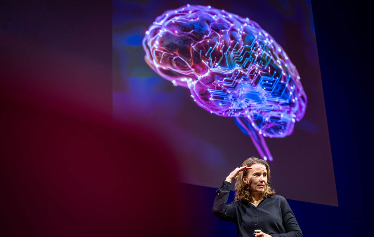 Deze bijzondere foto paste jammer genoeg niet in een van de reportages, maar die is volgens onze zeer gewaardeerde Frank ‘alles dat je als fotograaf wil’. “Het was even wachten tot zij precies onder die afbeelding van hersenen ging staan en dan is het ook nog net of ze salueert. Kon niet beter.” Vandaar dat we ‘m hier parkeren. ‘Zij’ is trouwens Deborah Nas, hoogleraar aan de TU Delft en begenadigd spreker over innovatie.