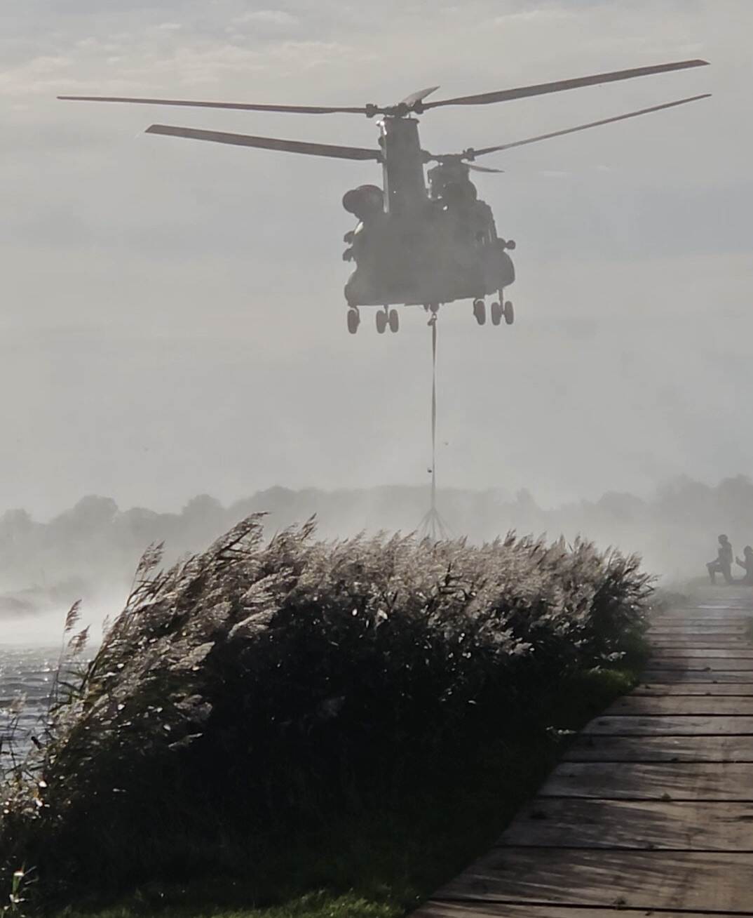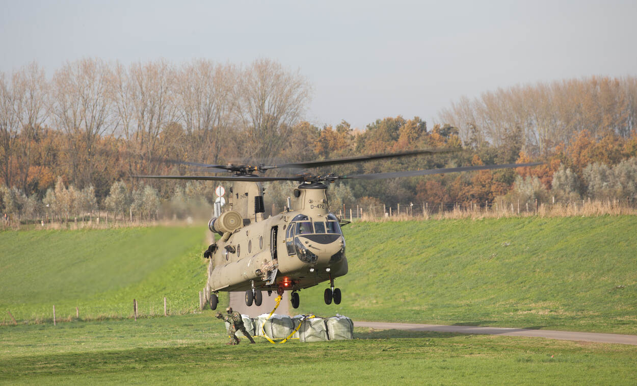 De oefening Wolkbreuk zorgt niet geheel verrassend voor een golf aan inzendingen. Vorige week nam 298 squadron twee dagen deel aan deze oefening in de omgeving van Schalkwijk. De vaste lezer weet dat er dan één vriend van deze rubriek aanwezig móét zijn: Manolito Jaarsma. “Deze foto is genomen bij het pick-up point aan de Lekdijk, net na het aanhaken van de zandzakken door MAOT”, bericht Manolito. Die afkorting staat trouwens voor Mobile Air Operations Team.