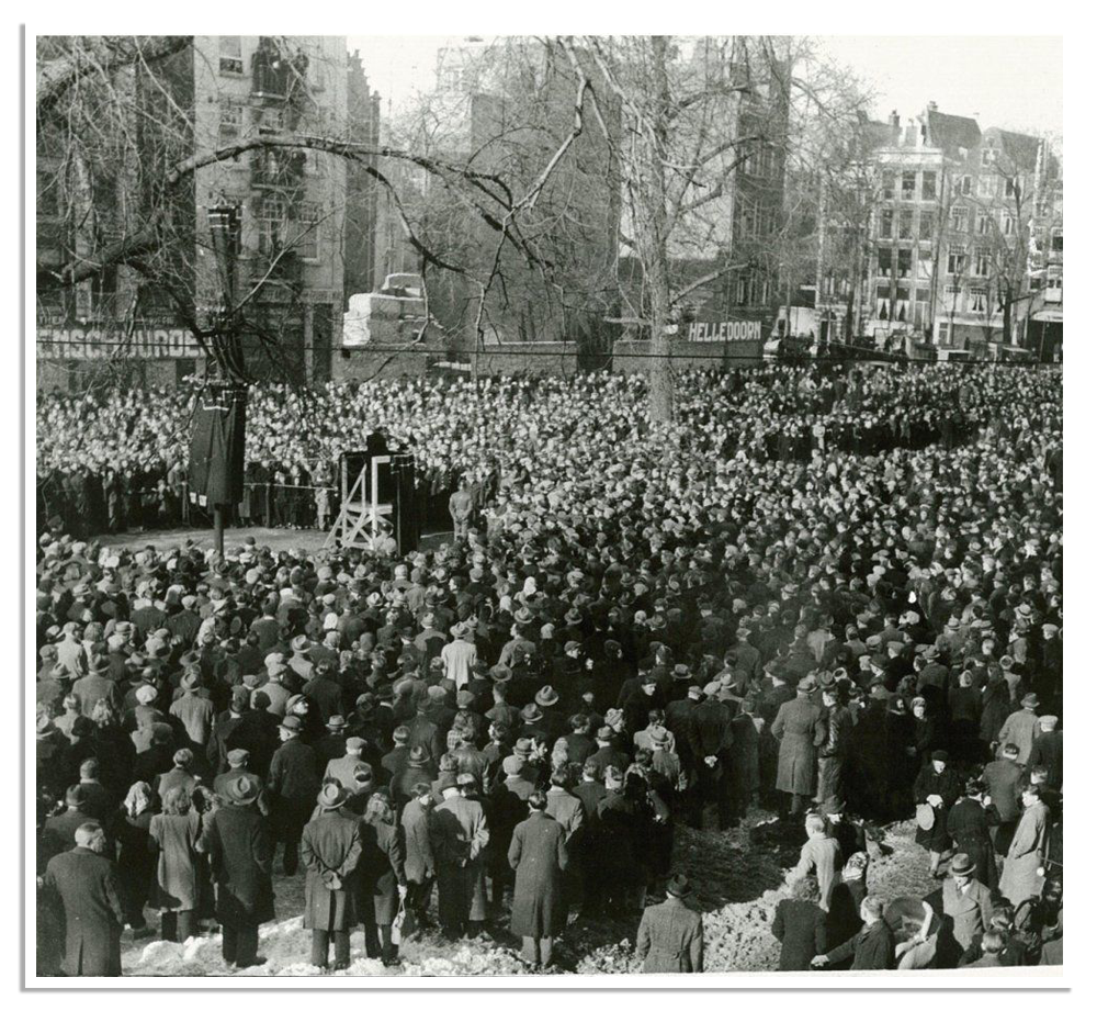 In het hart van de hoofdstad staat het standbeeld in brons, ter nagedachtenis aan de Februaristaking van 1941. Op 25 februari dat jaar leggen duizenden Amsterdammers het werk neer uit protest tegen de zogenoemde razzia’s (Arabisch-Frans woord voor ‘aanval’). Op 22 en 23 februari pakken de Duitsers met veel geweld 25 Joodse mannen op. Dat schiet onder anderen vakbondsleider, communist en verzetsman Dirk van Nimwegen in het verkeerde keelgat. Hij roept de havenarbeiders op de volgende dag het werk uit protest neer te leggen.