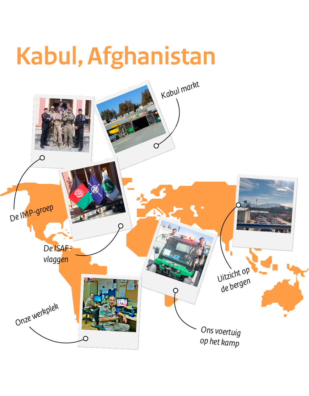 "Wij zijn namens de KMar werkzaam in het International Military Police-team op het hoofdkwartier van ISAF (International Security Assistance Force) in Kabul. De plaatsing duurt 6 maanden. Wij werken samen met 4 Italiaanse Carabinieri, een Roemeense MP en 1 Amerikaan. Samen zorgen wij voor de veiligheid op het kamp. Het ISAF-kamp heeft een oppervlakte van 1,5 vierkante kilometer en wordt bevolkt door een kleine 2.400 medewerkers.