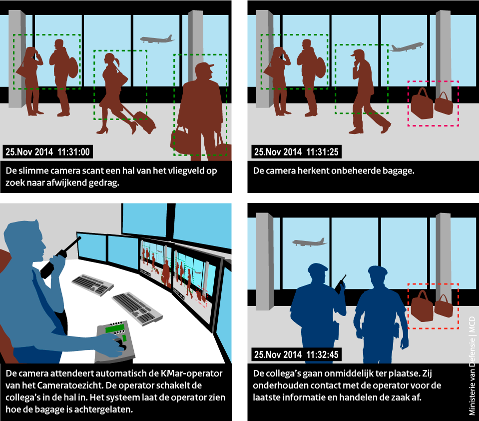 De KMar werkt samen met TNO en Qubit-Visual Intelligence (QVI) aan de techniek om de camera's slimmer te maken. "Maar", nuanceert De Moel, "personen worden niet herkend. De computer reduceert mensen feitelijk tot harkfiguurtjes. Het is ook niet zo dat de techniek straks de collega's op Schiphol aanstuurt, zoals is gesuggereerd. Aan de werkwijze verandert niets. Het ondersteunt de KMar-operators van het Cameratoezicht bij het bekijken van de grote hoeveelheid camerabeelden. De bedoeling is dat we automatisch worden geattendeerd op beelden waarop onbeheerde bagage, diefstal of een persoon die onwel wordt, is herkend."