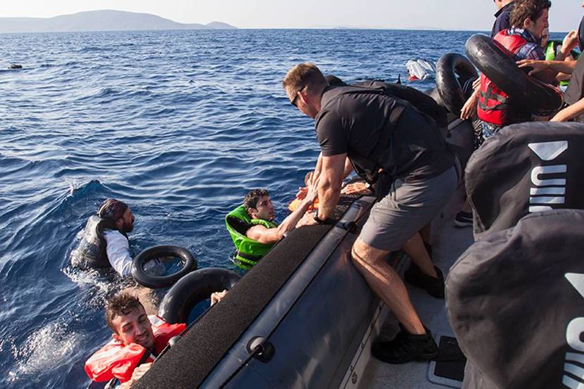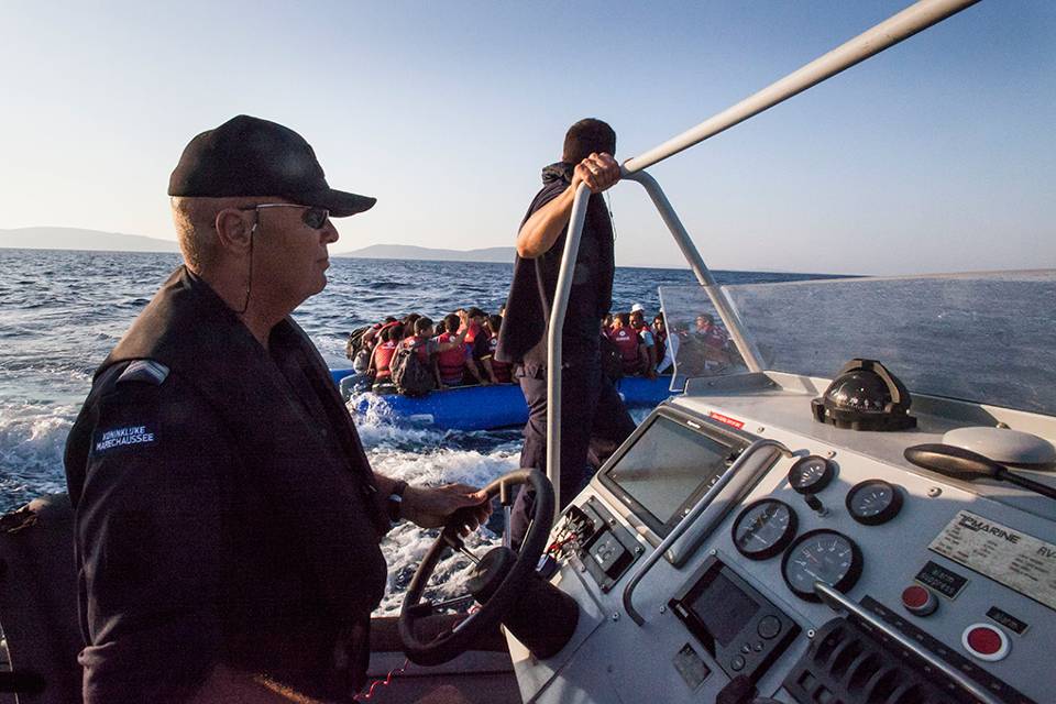Terwijl de RHIB dichterbij komt, blijkt dat het gaat om een rubberen boot met ruim 50 migranten. Mannen, vrouwen en kinderen. De opvarenden dragen feloranje zwemvesten. Het is hun enige bescherming tijdens de onberekenbare oversteek van Turkije naar Griekenland. De marechausseecollega's roepen dat ze de boot moeten volgen. De migranten zwaaien, lachen en bedanken de Nederlanders.