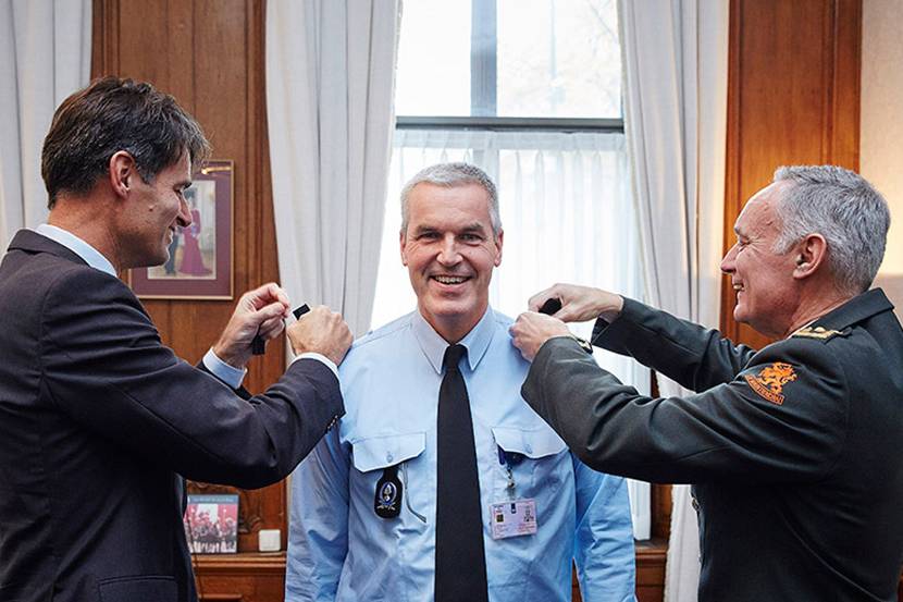 "We doen het namelijk niet alleen", legt Van de Brink uit. "Ook niet in het huidige veranderproces." Hij wil een ieders betrokkenheid vergroten. "Ik doe een beroep op alle medewerkers. Hoe kunnen we ons werk nog beter doen, onze verantwoordelijkheid nog beter dragen? Ik ga dat niet achter gesloten deuren bedenken. Ik heb de wijsheid niet in pacht. Daar hebben we het vakmanschap uit de organisatie voor nodig - van marechaussee tot generaal. Samen kunnen we ervoor zorgen dat de Marechaussee ook in de toekomst er staat als het erop aankomt."