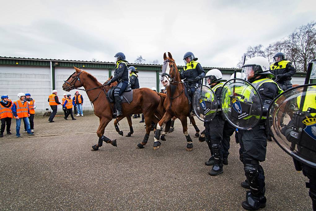 De collega's van de Bijstandseenheid (BE) van de Koninklijke Marechaussee zijn gespecialiseerd in het optreden in het hoge geweldsspectrum. Maar de BE kan de Mobiele Eenheid van de Nationale Politie ook ondersteunen als er moet worden opgetreden in het lage geweldsspectrum, zoals bij het aanspreken van personen waarbij niet vanaf het eerste moment een helm en schild nodig zijn. Door samen te trainen kunnen de KMar en de Nationale Politie procedures op elkaar afstemmen en in de praktijk toepassen. De afgelopen periode gebeurde dat op het mobilisatiecomplex Ede-Driesprong. Tijdens het bezoek van fotograaf Valerie Kuypers liep een fictieve huldiging van het voetbalelftal van Oranje-Zwart compleet uit de hand.