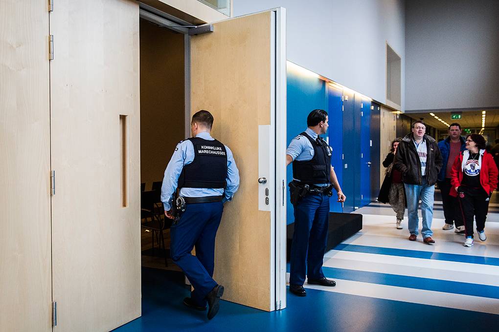 In de extra beveiligde rechtzaal van het Justitieel Complex Schiphol (JCS) vond op 18 maart de regiezitting van het proces tegen PVV-leider Geert Wilders plaats. Omdat het JCS binnen het werkgebied van de Koninklijke Marechaussee valt, is het de taak van de KMar om bijvoorbeeld demonstraties bij het justitieel complex in goede banen te leiden en de openbare orde te handhaven. Actiegroep Pegida kondigde een demonstratie aan. Fotograaf Valerie Kuypers ging mee met de Marechaussee.