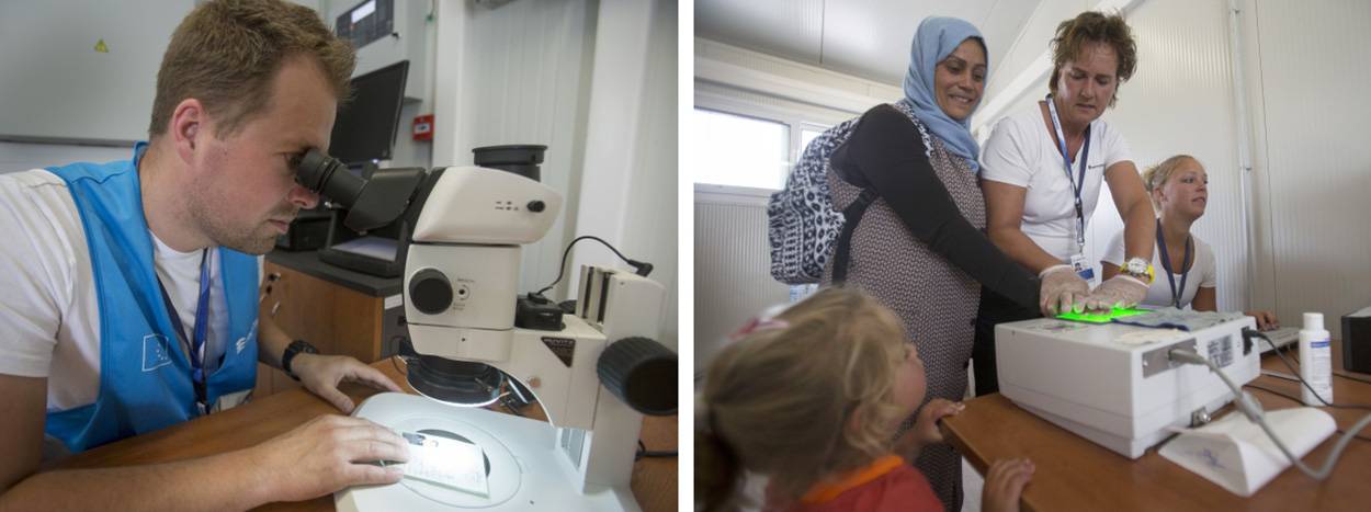 Zijn er wel documenten, dan komen ze onder de microscoop van wachtmeester-1 Jochem. Hij werkt samen met een Duitse collega; ze vullen elkaar aan en maken gebruik van elkaars ervaring. "De docu-box die Frontex ter beschikking stelt, werkt volgens hetzelfde principe als de apparatuur die we op de brigade Waddengebied gebruiken. Documenten in het Arabisch, die we thuis niet zo vaak zien, controleren we met de Edison-database op de Ipad, en dat werkt perfect. Maar eigenlijk maakt het niet zoveel uit wat voor soort document je aangeboden krijgt: de opbouw en kenmerken van echtheid verschillen niet zoveel."