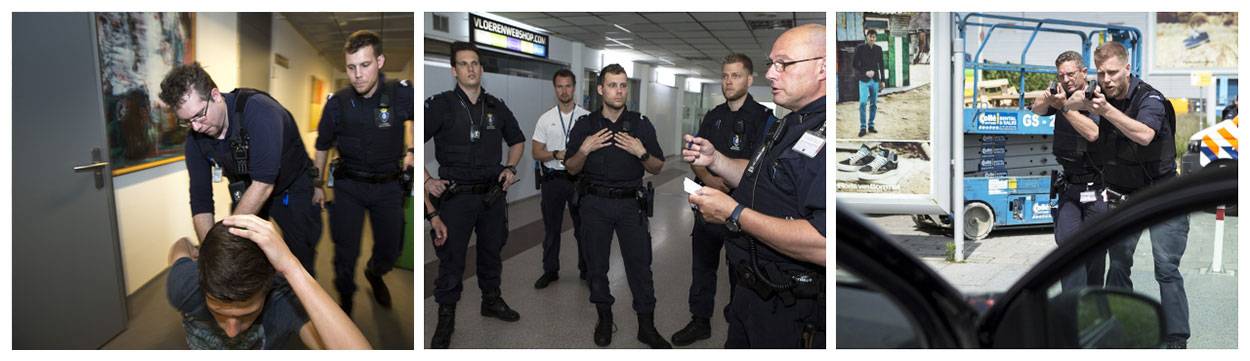 Het beoefenen van de protocollen gebeurt onder toezicht van trainer wachtmeester-1 Damian, van het Integrale Beroepsvaardigheden Team Zuid. Hij en zijn mannen zijn erop getraind collega's met kennis en kunde op het gebied van aanhouding en meer bij te staan. Vanwege het grote belang ervan zijn - in het als een carrousel ingedeelde oefenschema - ook de amok- en de pandenprocedure opgenomen. Plaats van handeling hiervoor is niet de terminal maar het European Business Centre op het bedrijventerrein, bij de brigade net om de hoek. Op de bovenste verdieping werd een passende setting opgebouwd. Alsof amokmakers daadwerkelijk een spoor van zinloze destructie achterlieten, zijn hier en daar 'dode' en 'gewonde' figuranten weggelegd. Kort na de oproep om bijstand, verschijnen wachtmeester-1 Teun en buddy ranggenoot Jos als eersten ten tonele.