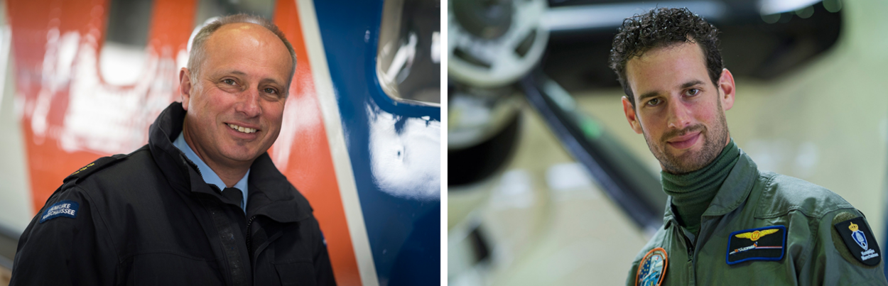 Links: Kapitein Jaap van Veen, liaison bij de Kustwacht: "We hebben onze toegevoegde waarde al bewezen." || Rechts: Wachtmeester-1 Dennis, KMar-luchtwaarnemer: "Met de helikopter kun je in een kort tijdsbestek een flink gebied afzoeken."
