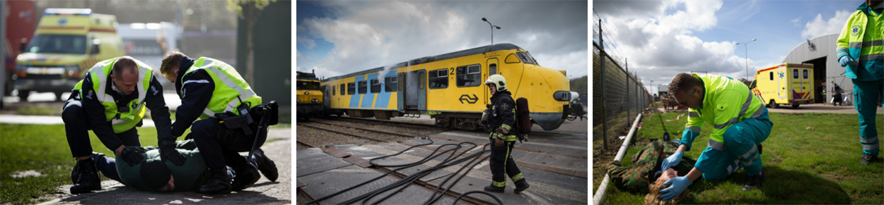 Een aanslag in een trein, een gijzeling voor de deur van een kinderdagverblijf en een groep raddraaiers die hulpverleners te lijf gaat. Brandhaarden, gewonden, slachtoffers en schermutselingen zorgen voor hectische situaties op het brandweeroefenterrein in het Drentse Wijster. En dat is precies de bedoeling. De brigade Politie en Beveiliging (P&B) en de brandweer en ambulancedienst van Schiphol oefenen namelijk in zes sessies van twee dagen het multidisciplinaire optreden en samenwerken in crisissituaties.