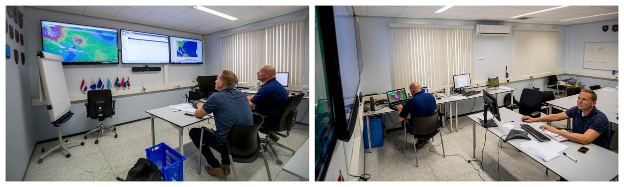 6 dagen na de passage van ‘Irma’ doet de airco het weer op het kantoor van Hesen. Zo kan hij het hoofd koel houden bij het aansturen van zijn 30 marechaussee-collega’s op het eiland plus een tiental uit Curaçao en Nederland. Ook 25 Nederlandse politiemensen zijn inmiddels opgenomen in de gelederen. Hun taak: het ondersteunen van het Korps Politie Sint-Maarten (KPSM).