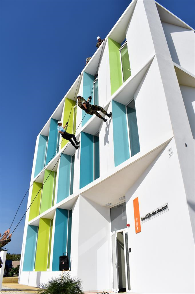 Op de marinierskazerne Savaneta op Aruba is deze maand het nieuwe kantoor van de Marechaussee geopend. Dit gebeurde op ludieke wijze; vóór de opening kwamen brigadecommandant van de brigade Caribisch Gebied, Hans Vroegh en de kazernecommandant, Timon van Dishoeck, abseilend van het nieuwe gebouw.