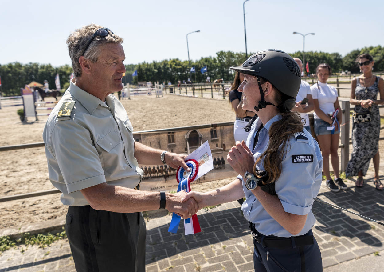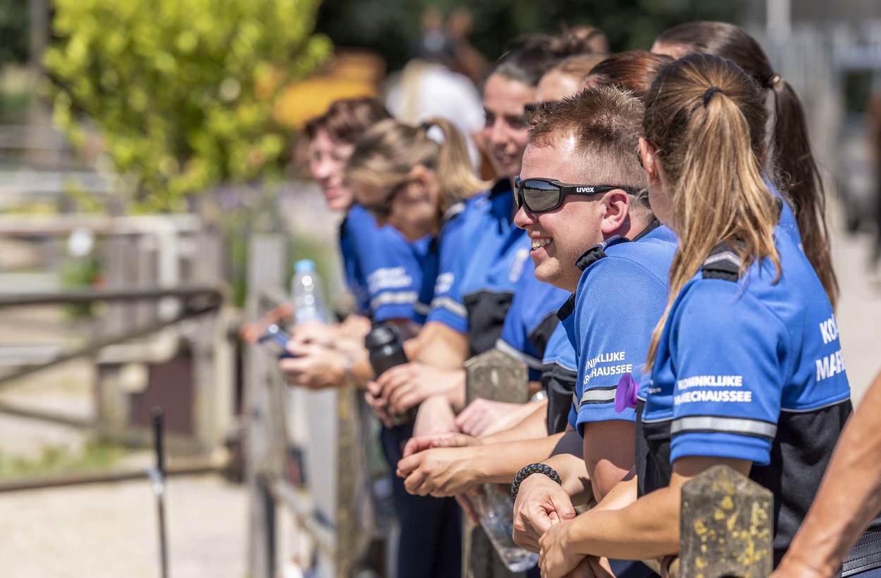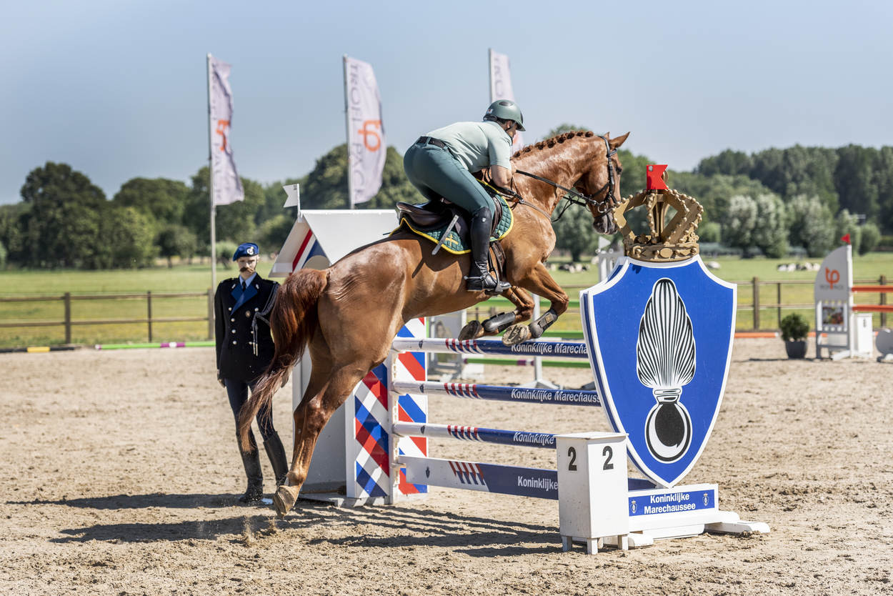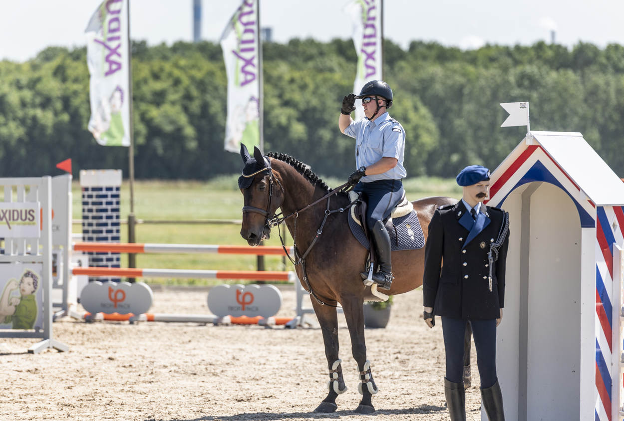 Ze trappelen van ongeduld, de ruiters die bij manege Middenhof in Maassluis de ring betreden voor de Outdoorwedstrijd Springen & Dressuur van de Marechaussee. Voor de marechaussees van het Ere-escorte van de Bereden Brigade is dit een ideale mogelijkheid om te laten zien wat ze waard zijn en om onder druk te trainen. Normaliter komen ze in het geweer bij ceremoniële gebeurtenissen als Prinsjesdag. Maar ook wanneer een nieuwe ambassadeur in ons land, gezeten in een koets, zijn geloofsbrieven aan de koning gaat aanbieden.