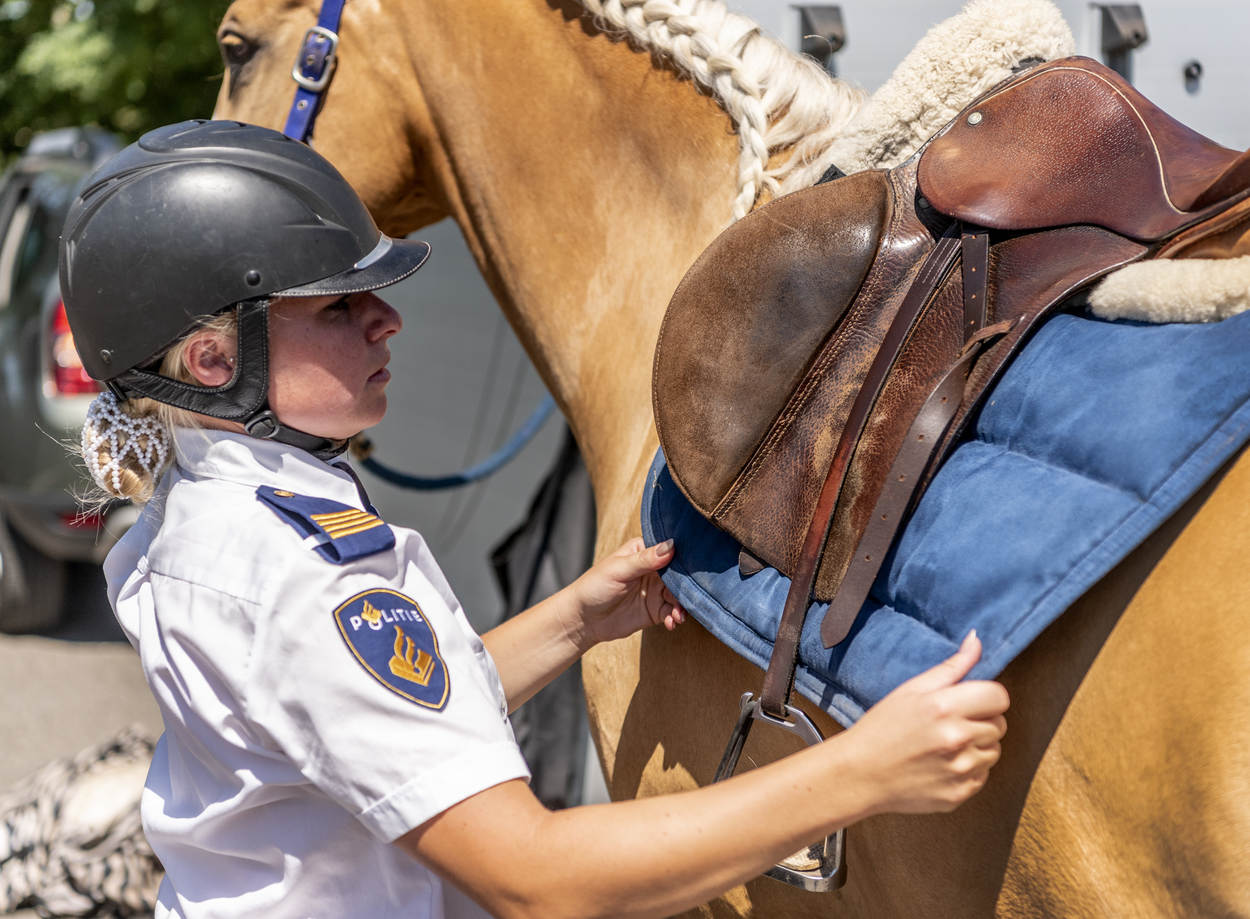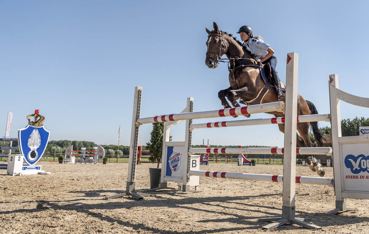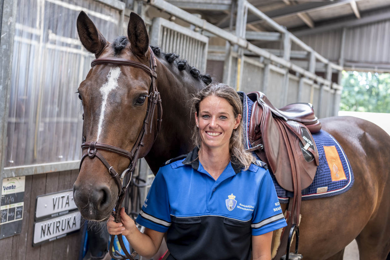 Ze trappelen van ongeduld, de ruiters die bij manege Middenhof in Maassluis de ring betreden voor de Outdoorwedstrijd Springen & Dressuur van de Marechaussee. Voor de marechaussees van het Ere-escorte van de Bereden Brigade is dit een ideale mogelijkheid om te laten zien wat ze waard zijn en om onder druk te trainen. Normaliter komen ze in het geweer bij ceremoniële gebeurtenissen als Prinsjesdag. Maar ook wanneer een nieuwe ambassadeur in ons land, gezeten in een koets, zijn geloofsbrieven aan de koning gaat aanbieden.