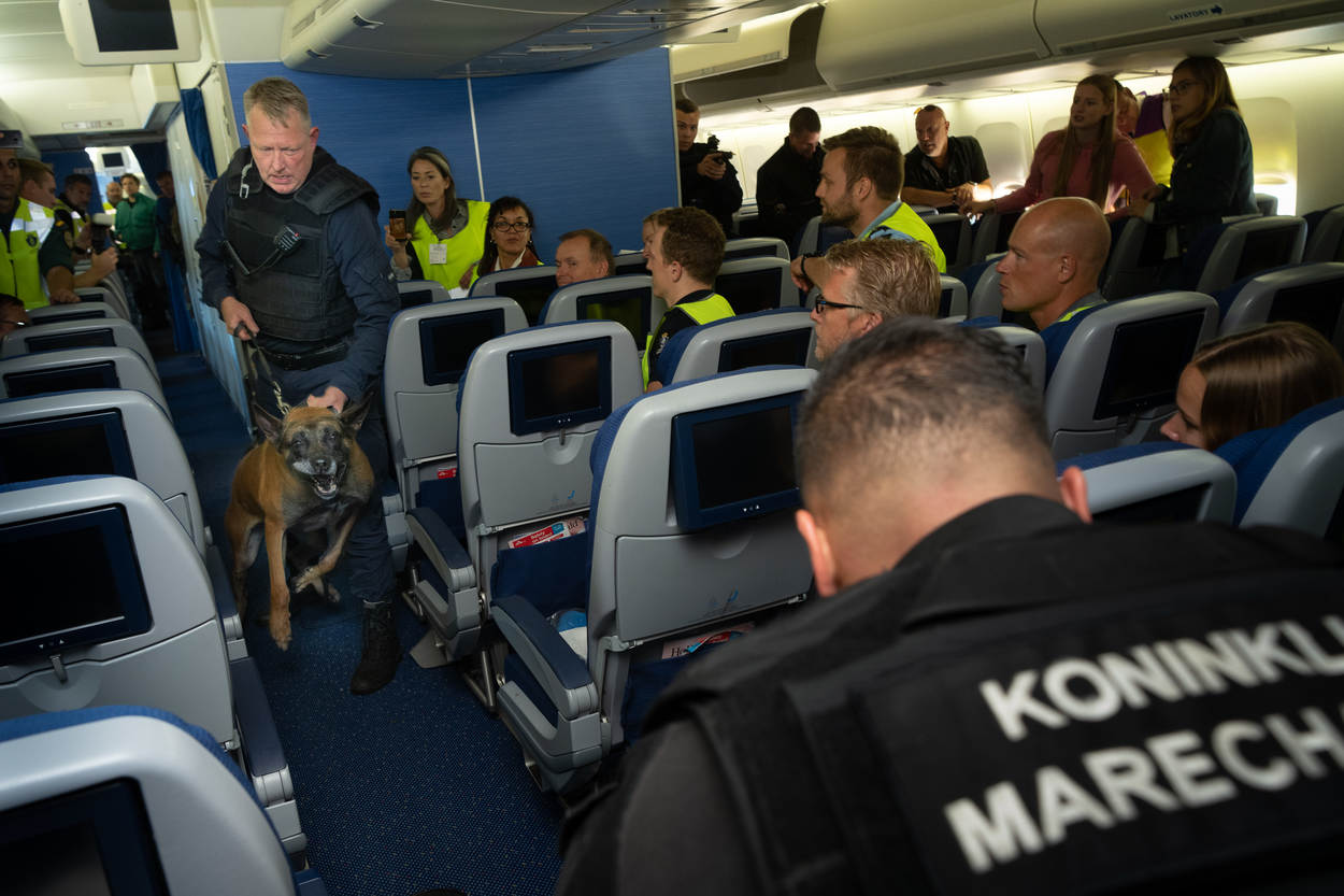 De opperwachtmeester opereert samen met 4 leden van de Hoog Risico Beveiliging (HRB) en oefent samen met hondengeleiders van de Nationale Politie, de Belgische Federale Politie en een lid van de Belgische antiterrorisme-eenheid de aanhoudingsprocedures. Ze leren van elkaars methode, waarin uiteraard ook overeenkomsten zitten. De diverse scenario’s spelen zich voornamelijk af in kleine vliegtuigruimtes en een bouwkeet op Schiphol-Oost. “Dergelijke oefenlocaties, zeker een echt vliegtuig, zijn zeldzaam”, weet oefenleider wachtmeester-1 Maikel Ponsen.