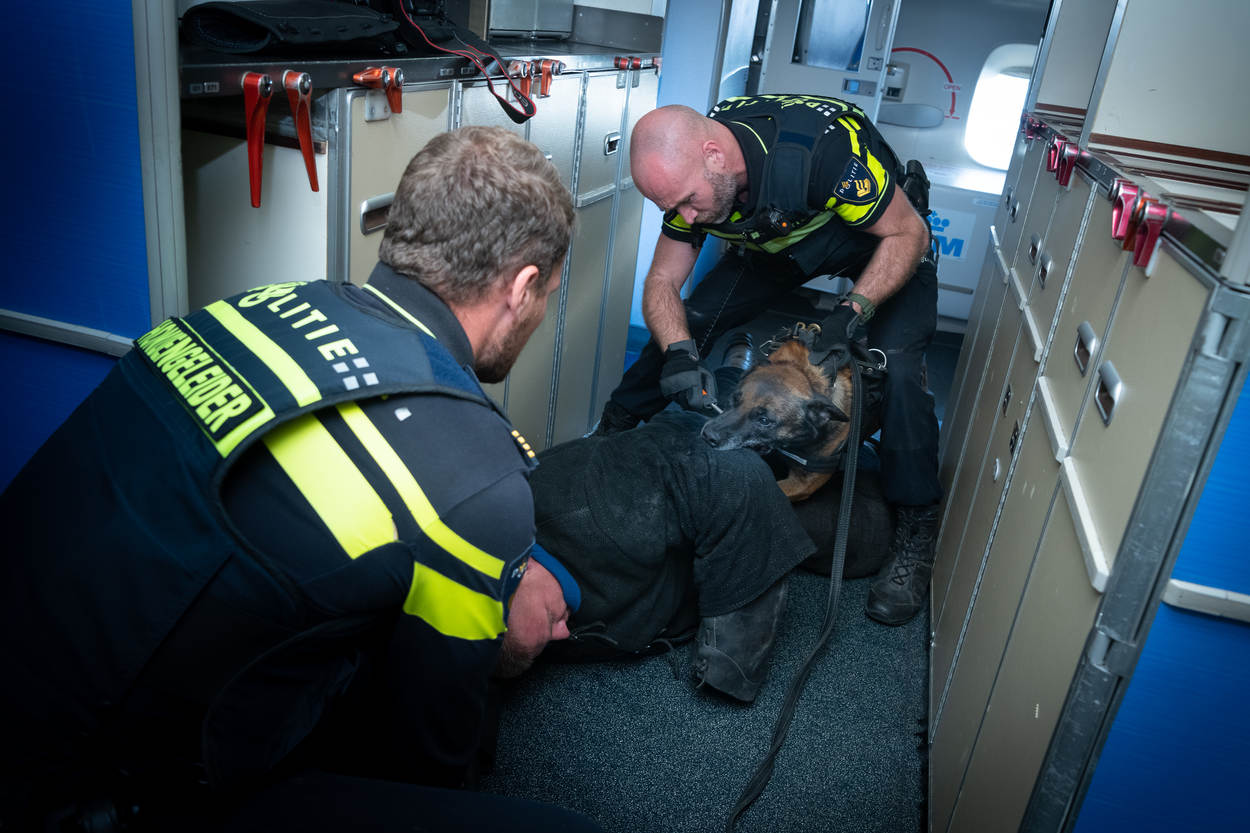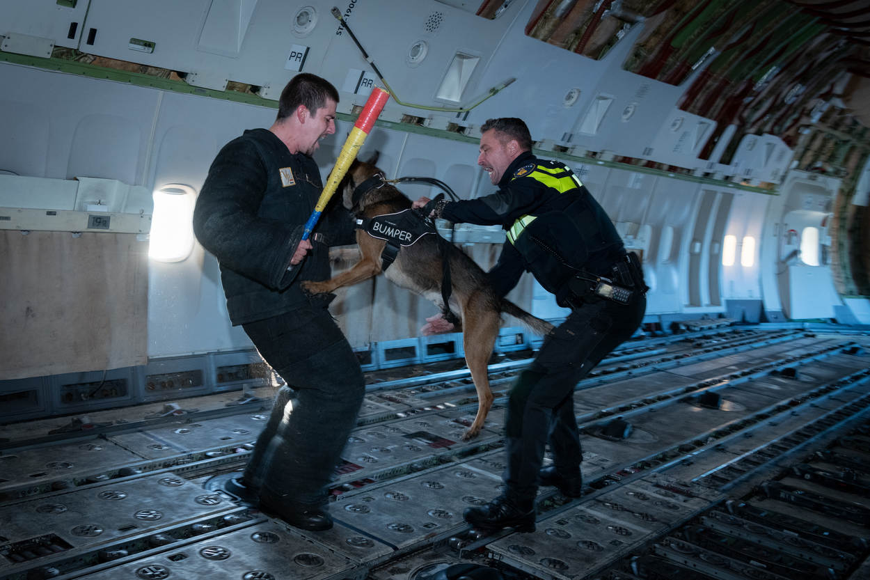 Woeste geluiden uit het vliegtuigtoilet op Schiphol-Oost. Gehijg, gesjor en gegrom. “Laat me los! Alsjeblieft!”, schalt het angstig smekend door de cabine. Een grote sterke kerel wordt flink in zijn kladden gevat door een fanatieke hond. De figuranten luisteren verschrikt naar het drama, ook al is het maar een oefening.