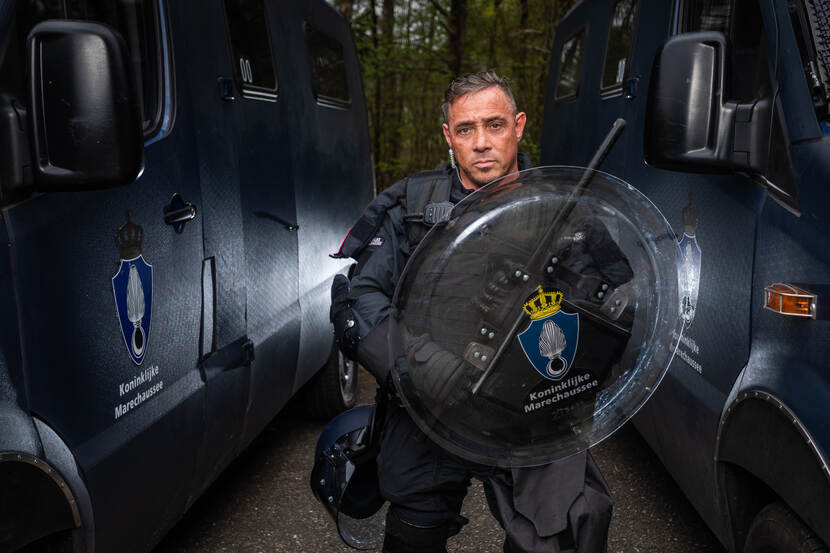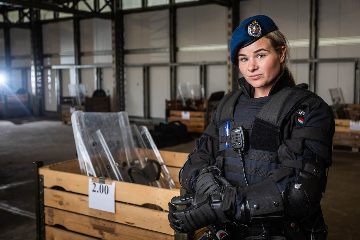 “De BE is de leukste neventaak die er is bij de KMar. Vooral het groepsoptreden spreekt mij aan. Je bent niets zonder elkaar. Bij de grensbewaking werk ik meer individueel. Tijdens de initiële opleiding stond de groep ook centraal, maar daarna heb ik dit in het werk een beetje gemist. Ik zit nu in week 2 van de BE-opleiding en heb meteen dat hechte groepsgevoel weer terug. Samen met de politie optreden, wat we nu oefenen, vind ik top. Het is gewoon supervet om gebruik te maken van hun kennis en expertise. Het geeft een geweldig gevoel om in linie te staan en 6 politiepaarden daveren langs je heen. Heel de menigte zie je opeens wegstuiven. Mooi toch?”