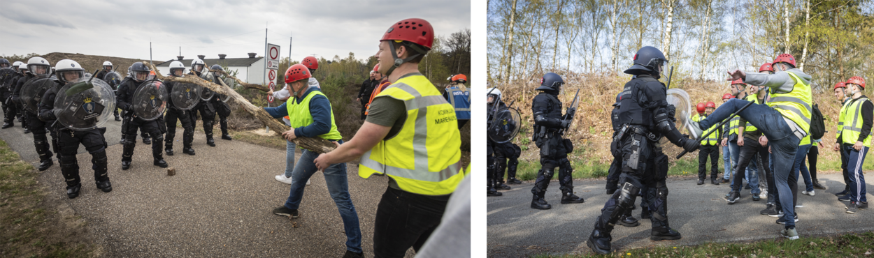 De collega’s, die zich op dit moment onderdompelen in de wereld van de BE, oefenden vorige week voor het eerst samen met de politie. Daarbij maakten zij kennis met de waterwerper van de ME en politiepaarden en -honden. Ook stonden ze, sommigen voor het eerst, tegenover grote groepen ‘demonstranten’.