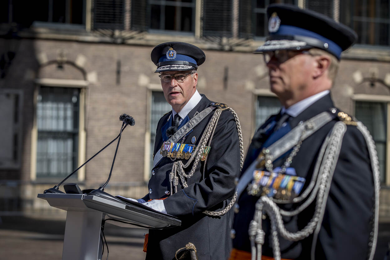 Luitenant-generaal Harry van den Brink sprak alle aanwezigen toe op het Binnenhof in zijn afscheidsrede. Hij benoemde onder meer zijn gezondheid, zijn tijd als Commandant van de Koninklijke Marechaussee en bedankte familie, vrienden en collega’s voor de steun en mooie jaren bij de KMar.