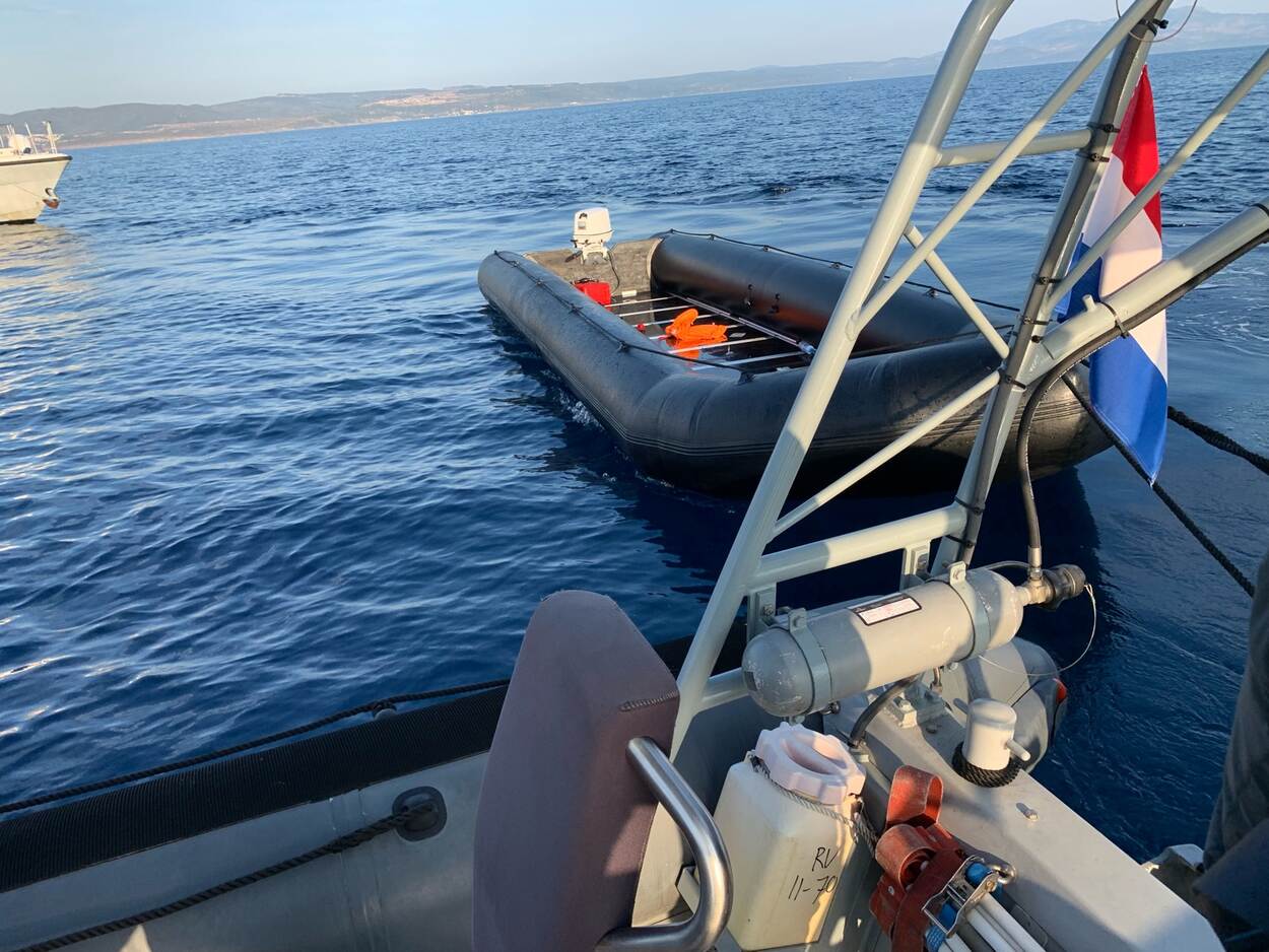We waren – heel uitzonderlijk – met 5 in plaats van 3 man aan boord van onze 11 meter lange RHIB-motorboot, onder wie onze Griekse liaison. Een geluk bij een ongeluk, zo bleek later. De sfeer was gemoedelijk. Tot we in de verte een raar object in het water zagen.