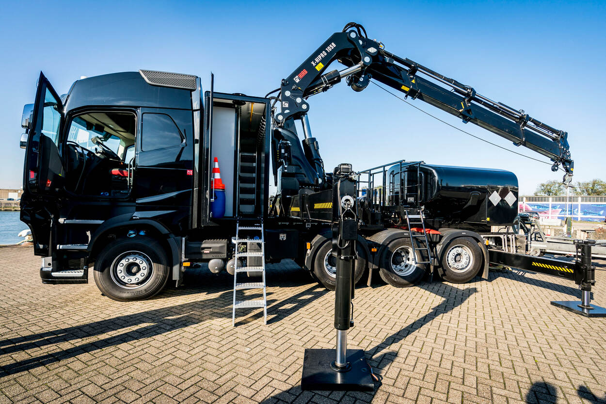 Op het eerste gezicht lijkt de FH500 een normale vrachtwagen met een standaard Volvocabine. Maar wie goed kijkt, ziet een speciale combinatie van vrachtwagen en kraan. Speciaal voor de Marechaussee geproduceerd. “Van deze is er maar 1 in de wereld. En, die hebben wij.” De Brigade Speciale Beveiligingsopdrachten (BSB) oefende met de FH500 takelvrachtwagen.