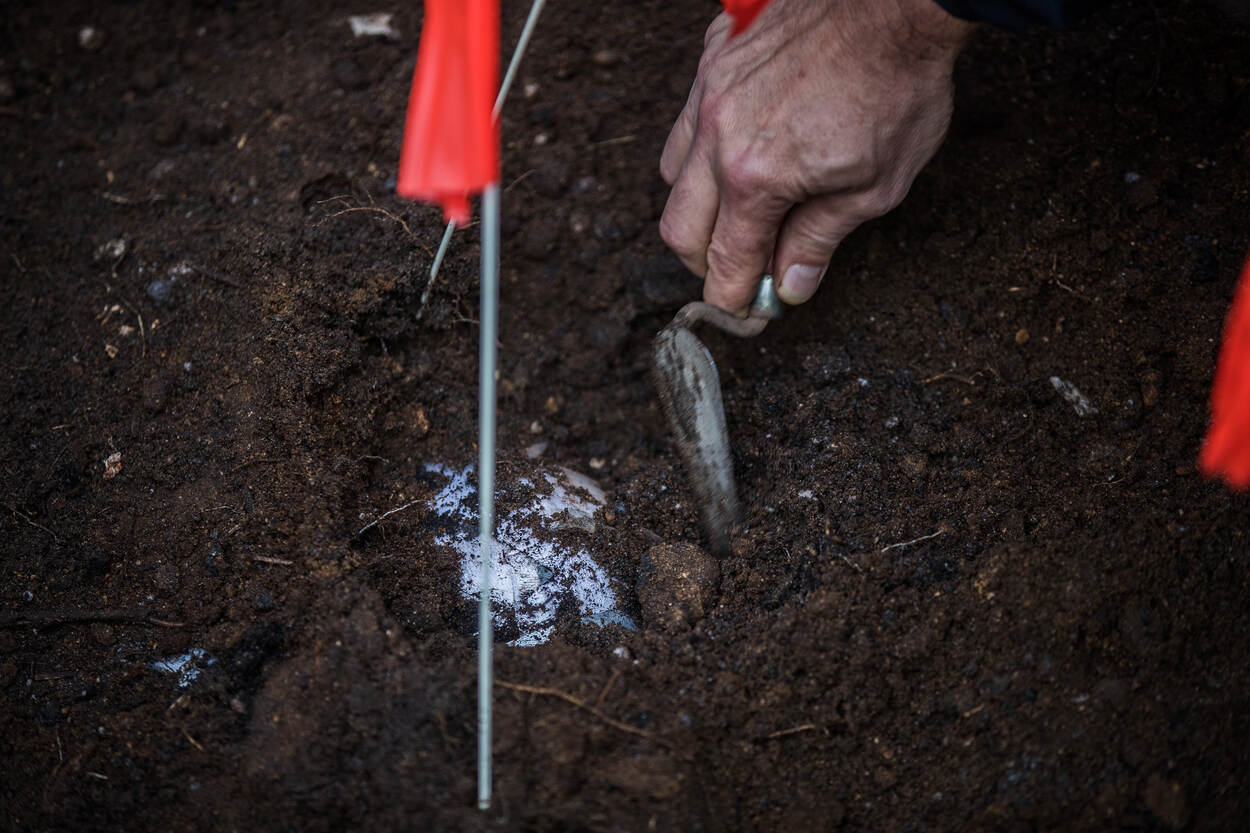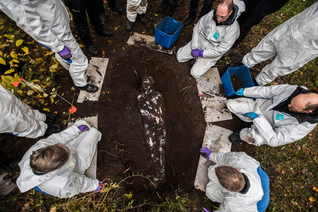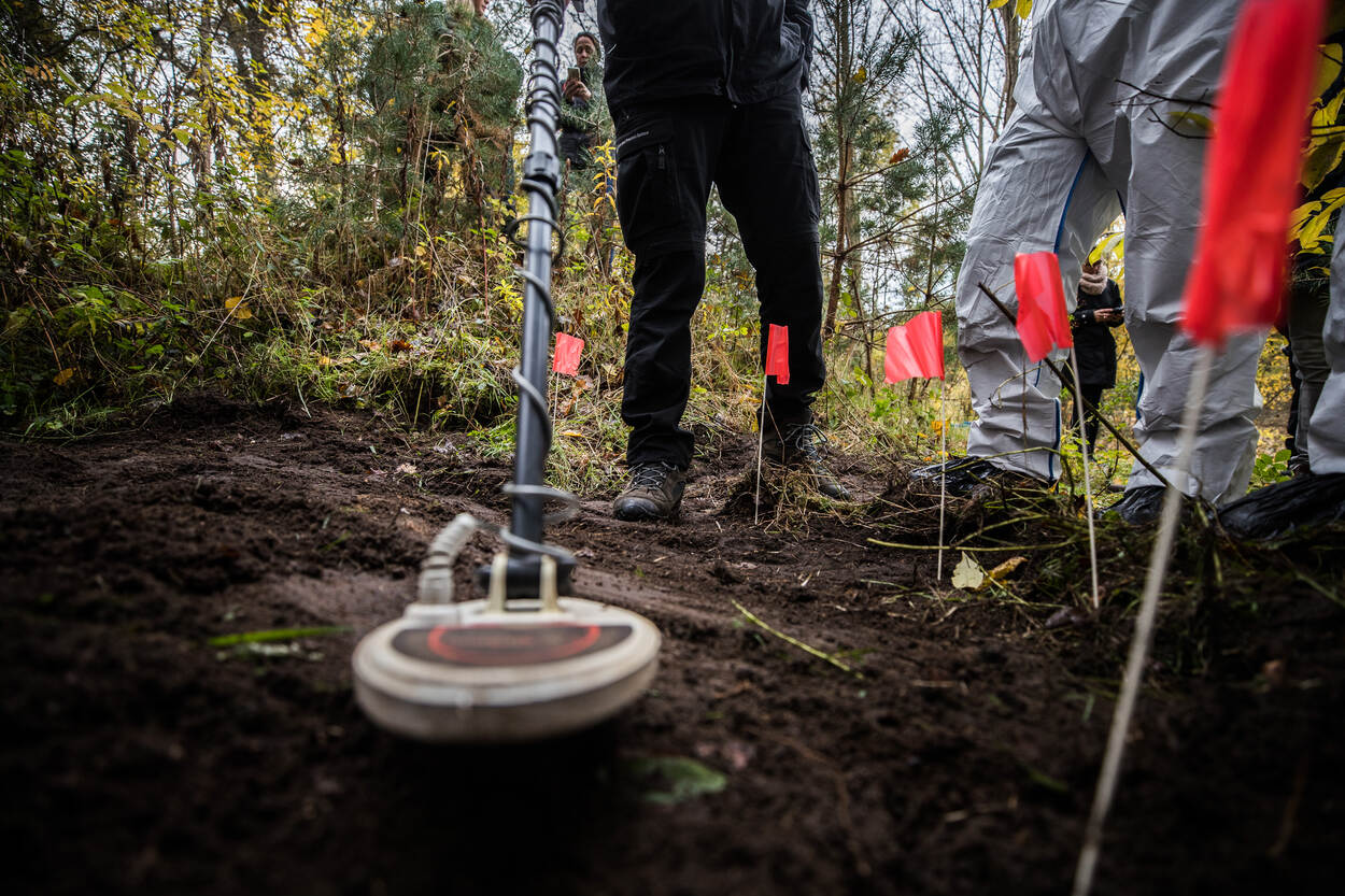 2 aangeklede poppen, 2 nepskeletten, enkele kogelhulzen en een graafmachine. Met dat opmerkelijke arsenaal arriveerde de oefenleiding afgelopen voorjaar op de landmachtkazerne in Wezep om de oefening alvast in de steigers te zetten. In totaal prepareerden ze 4 graven in verschillende settingen: in een zandwal, op beton in de grond met een gangenstelsel eronder, in droge poedergrond onder een dennenboom én in een drassig stuk grond. Aan de forensische experts van de betrokken partijen de taak om de graven te vinden, bloot te leggen, bewijsstukken op te graven en veilig te stellen.