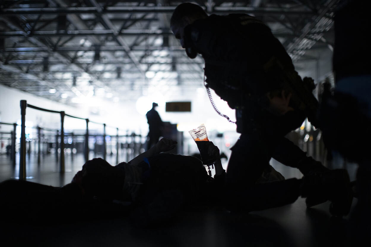 Als het arrestatieteam van de Brigade Speciale Beveiligingsopdrachten een instap doet, kunnen er gewonden vallen. Behalve de medic trainen daarom alle leden van het AT hoe ze medisch moeten handelen onder gevaarlijke omstandigheden. In Harderwijk gaan dus niet alleen het wapenschild, de taser en het lange wapen mee, maar dit keer dus ook de medic-tas. Foto: Jarno Kraayvanger