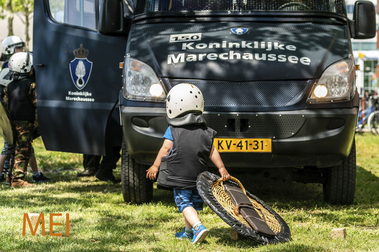 Wat de Marechaussee doet voor de veiligheid van Nederland? Op die vraag geeft de Marechaussee antwoord op de Landelijke Veiligheidsdag in Almere. Meteen een mooie gelegenheid om bezoekers warm te maken voor het vak. Alhoewel de jongste bezoekers toch echt nog een tijd moeten wachten voor ze kunnen solliciteren. Foto: Paul Tolenaar