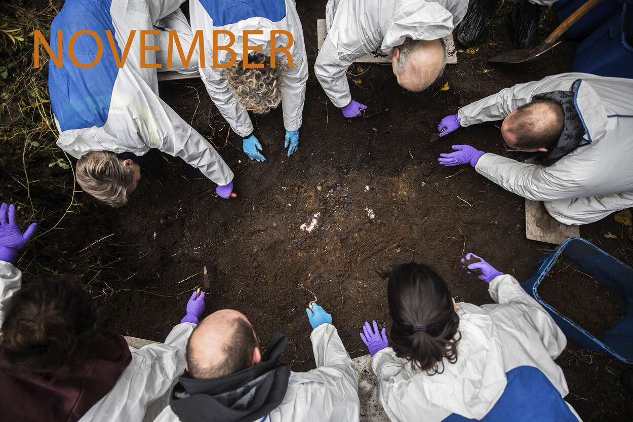 22 forensische experts van de KMar leggen samen met het Nederlands Forensisch Instituut en de politie een oefengraf bloot op een plaats delict. Niet bepaald de core business van de KMar, maar als het nodig is kun je maar beter voorbereid zijn. Om te oefenen werden er daarom maanden eerder graven geprepareerd op een landmachtkazerne in Wezep. Foto: sergeant Jan Dijkstra