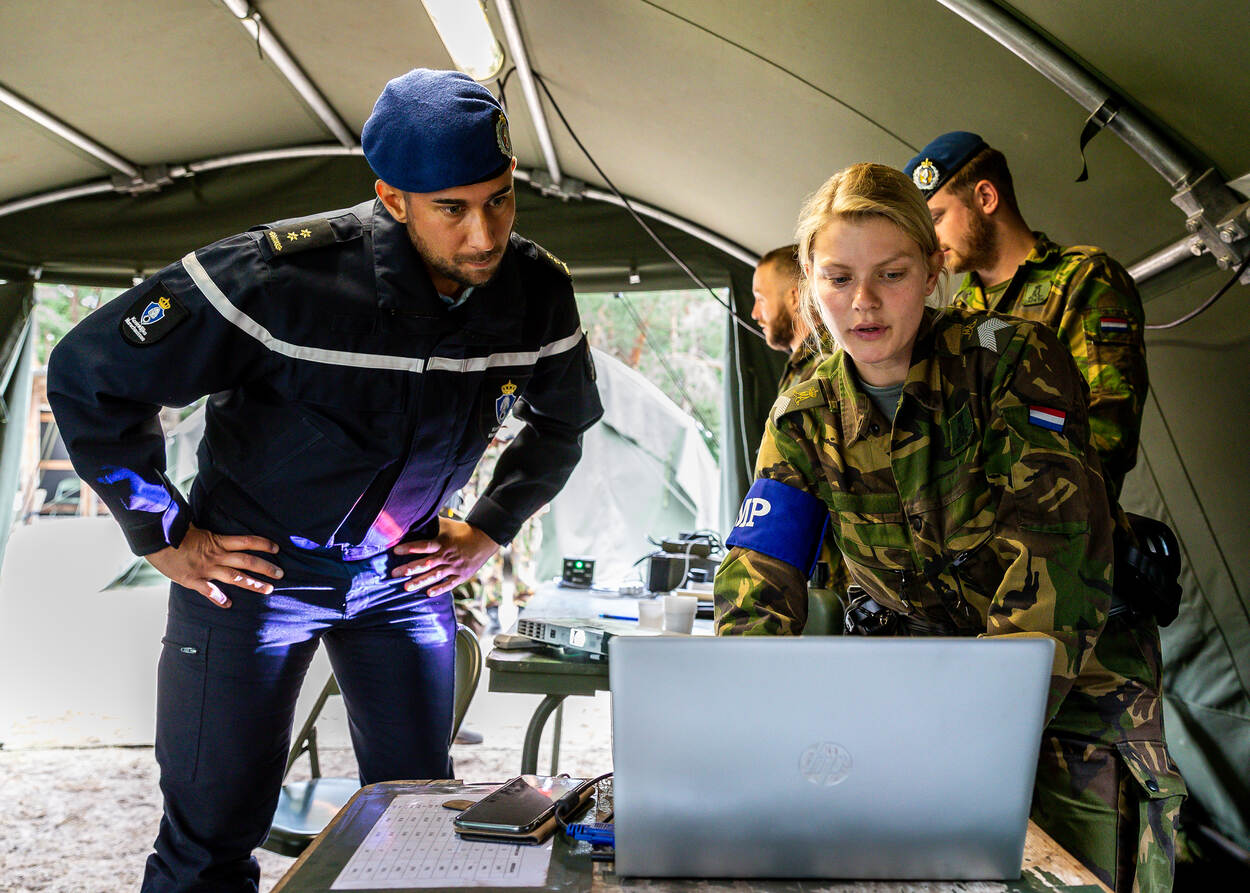 Volgens het scenario bevonden wij ons in een conflictgebied. Daar speelden zaken als mensenhandel en drugshandel, en er waren veel vluchtelingen. Wij werden als marechaussees ingezet voor Frontex, ter ondersteuning van de lokale autoriteiten. Dat betekende onder andere dat wij verhoren moesten afnemen en mensen moesten fouilleren en arresteren. Het was onze eerste ‘blauwe’ oefening in het veld, dus extra leuk.