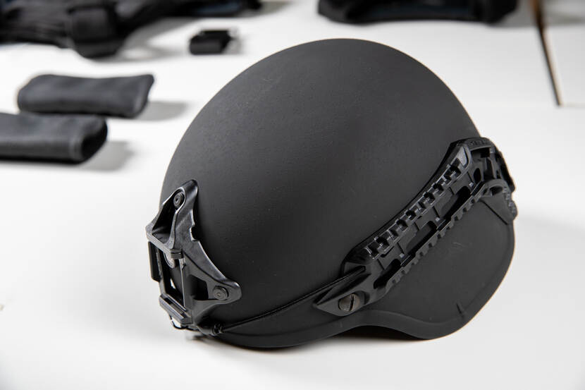 Edelman: "De nieuwe zwarte helm heeft een betere pasvorm, is lichter dan zijn voorganger en biedt betere bescherming. Gebruikers kunnen de helm makkelijker zelf afstellen. Aan de zijkant van de helm zit een railsysteem en ook aan de voorzijde kan de gebruiker hulpmiddelen bevestigen, zoals communicatieapparatuur, een camera, een verrekijker of night vision. In totaal heeft de Marechaussee 1.750 helmen aangeschaft. Als een gebruiker zich heeft ingemeten, wordt de helm verstrekt."