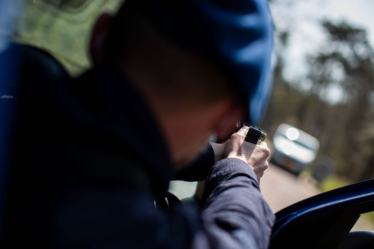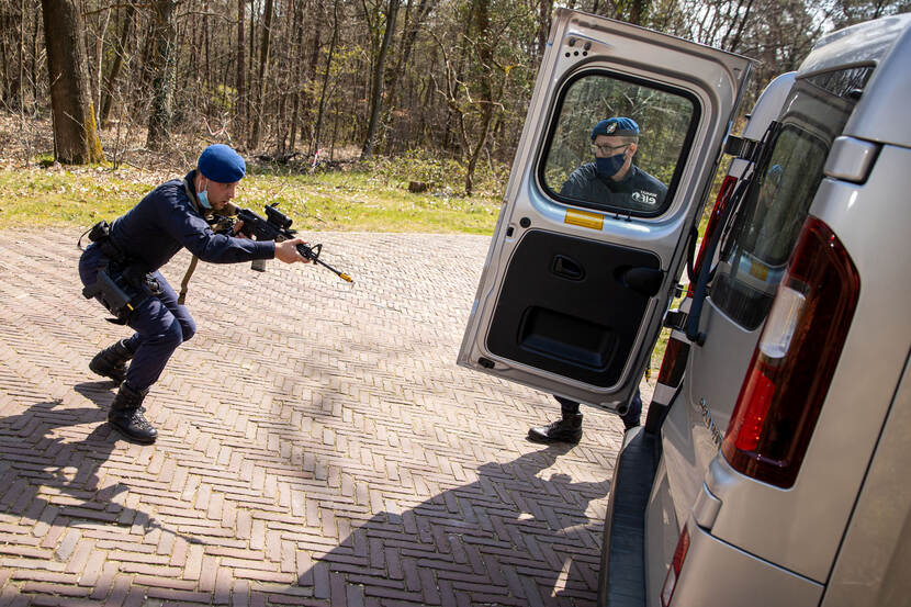 “Dit is de Koninklijke Marechaussee. Wij hebben een vuurwapen op u gericht”, klinkt het uit de megafoon. Achter de Amarok staan 2 gewapende marechaussees, gereed om in te grijpen. Voor hen: een scheef geparkeerd busje met daarin 2 vuurwapengevaarlijke verdachten.