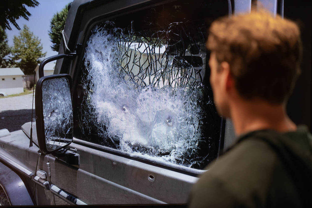 “Ik was met mijn collega’s toentertijd ongeveer 5 weken in het gebied. We hadden al erg veel beveiligingsklussen uitgevoerd. De situatie in de provincie was rustig, er gebeurde doorgaans weinig. Nederland had ook al te kennen gegeven het gebied binnenkort te zullen verlaten. Het was eigenlijk een dag als alle anderen. Het eerste deel van de rit verliep probleemloos. We verplaatsten door een glooiend landschap en over grote open vlaktes met aan weerszijden weilanden. Typisch voor Afghanistan. We reden een stukje vooruit zodat we op de plaats van bestemming alvast contact konden maken en de aankomst van de vips konden voorbereiden, zodat alles soepel zou verlopen. Dit liep anders. Vlak voor de stad zagen we midden op de weg een tiental personen staan die eruitzagen als Afghaanse politieagenten. Ze maakten met hun armen een kruisgebaar voor hun borst en maanden ons tot stoppen. Toen we de auto stil hadden gezet, keken ze wie er in het voertuig zaten. In eerste instantie leek er niks aan de hand, waarschijnlijk kwam dat door het uiterlijk van mijn bijrijder. Op het moment dat ze mij zagen, steeg de spanning en sloeg de situatie in een milliseconde om.”