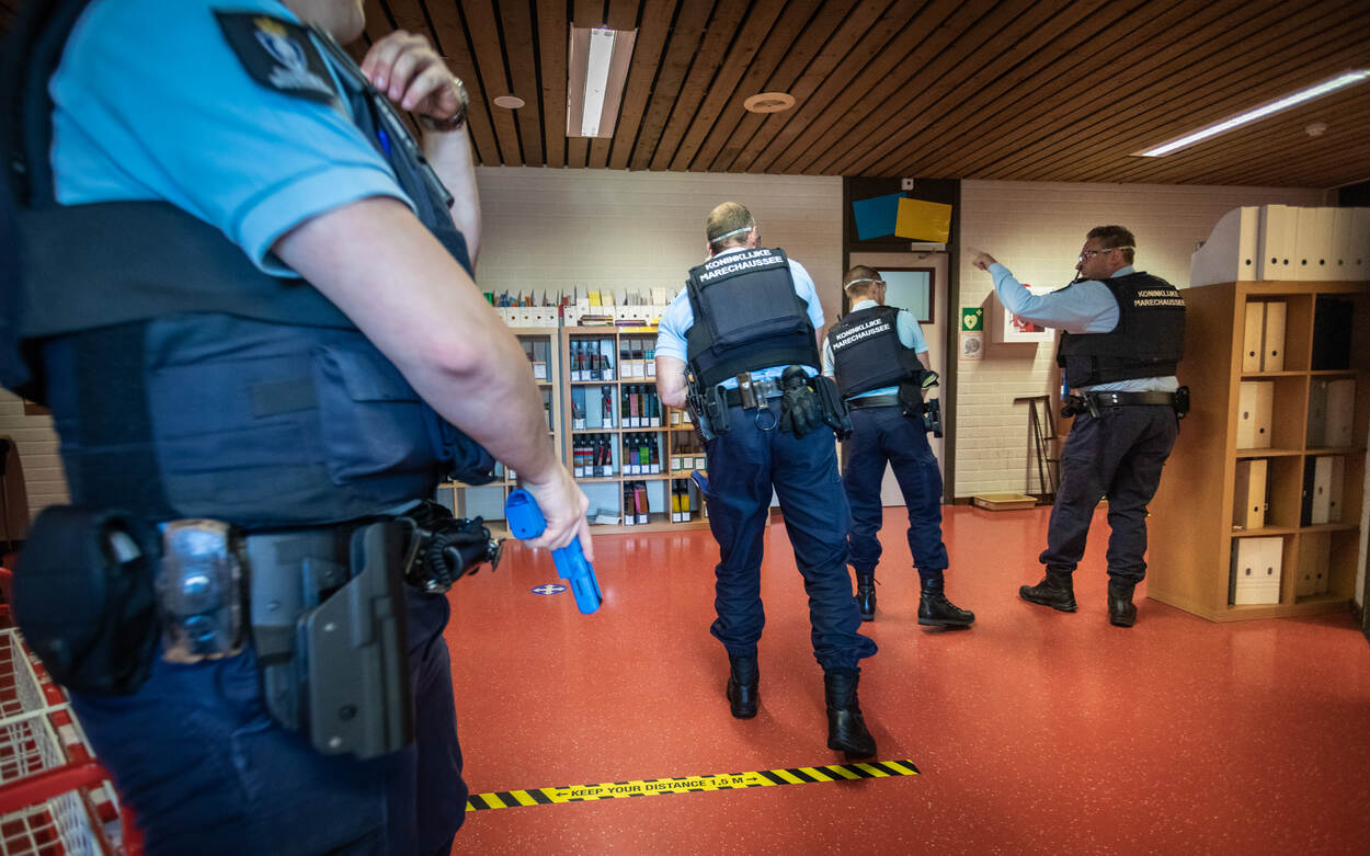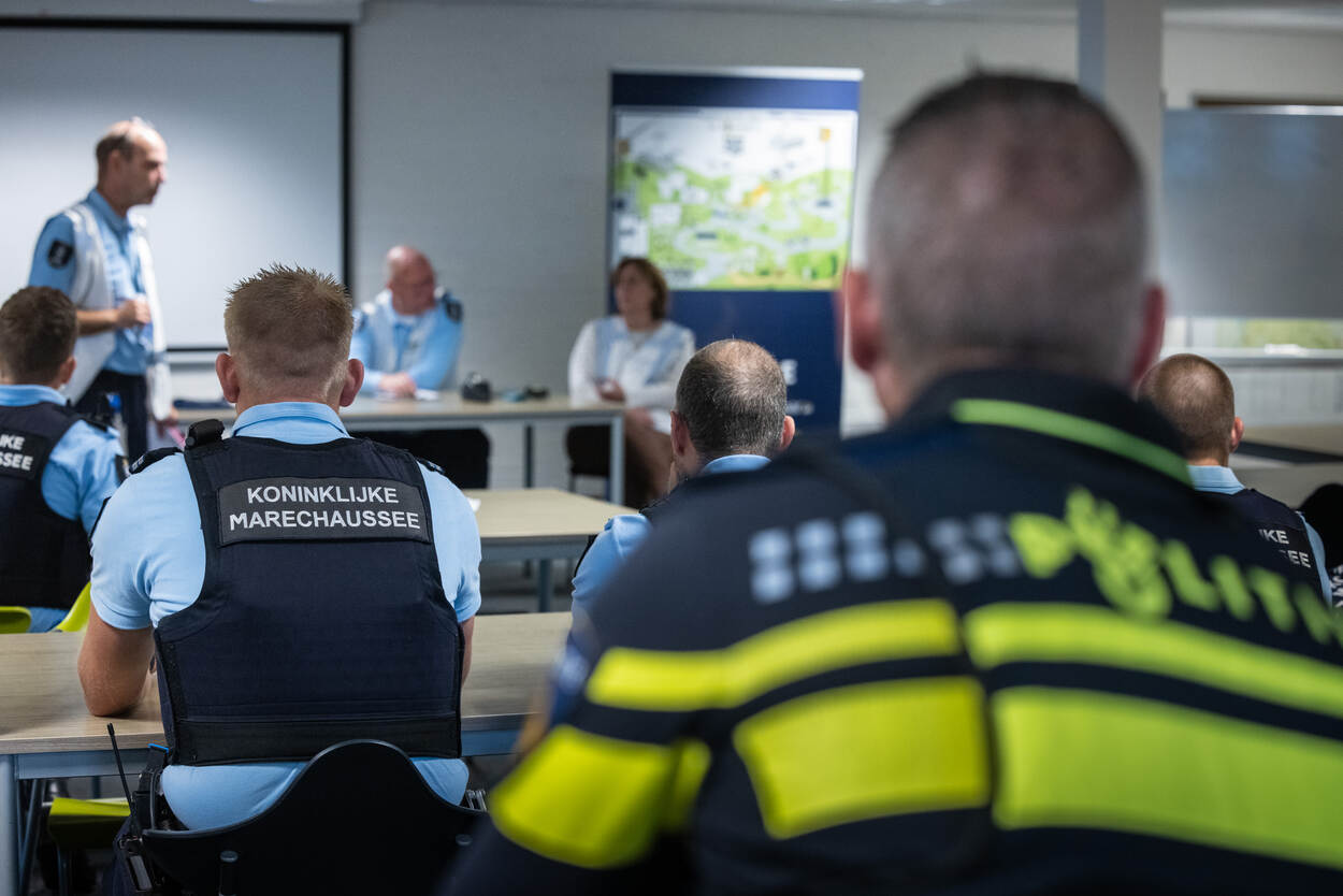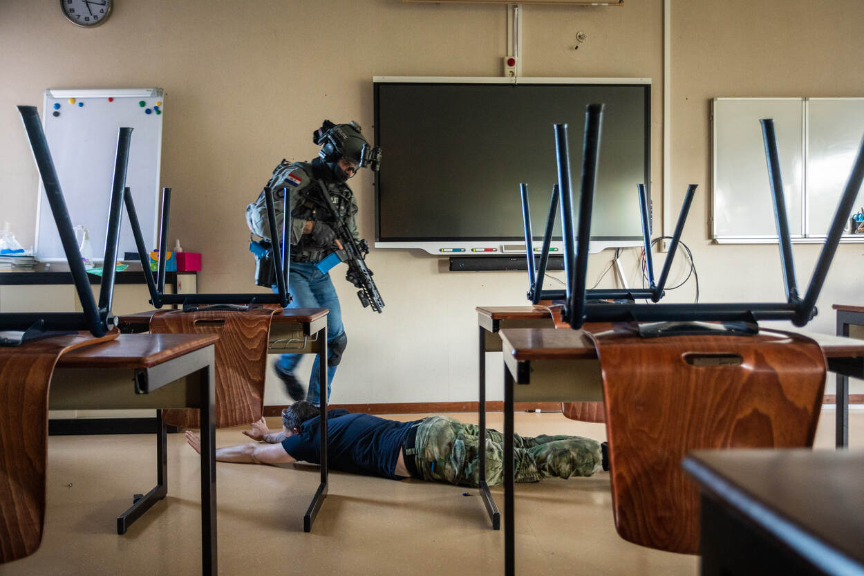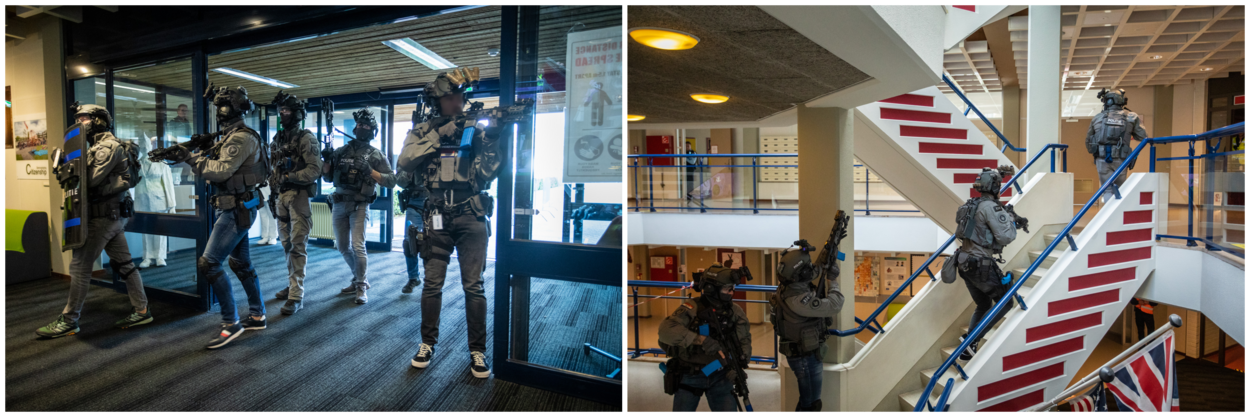 Voor de oefening krijgen de deelnemende eenheden oefenwapens en oefenmunitie uitgereikt. Ook de ‘schutters’ werden bewapend met oefenpatronen en oefenhandgranaten om het geheel zo realistisch mogelijk te maken. Voor de deelnemende eenheden moest het daardoor snel duidelijk worden dat ze met grof geweld te maken hadden en dat ze de situatie niet zelf konden afhandelen. Snel opschakelen zou essentieel zijn. Het begon allemaal op een rustige vrijdagmiddag op het politiebureau van Brunssum-Landgraaf. Daar werden de eenheden gebrieft over de oefening. Net als in het echt was het wachten tot de porto begon te 'rammelen'. De eenheden konden aan de bak toen de melding vanuit de meldkamer binnenkwam: ‘schutters op de AFNORTH International School’. Meerdere schutters gaan schietend door de school. Zij proberen zoveel mogelijk slachtoffers te maken. De mannen trekken verschillende vleugels van het gebouw in, wat de situatie extra ingewikkeld maakt voor de veiligheidsdiensten. “Attention, attention! We have a lockdown procedure.” De DBBO roept via de omroepinstallatie op de school om dat er schutters actief zijn. Ondertussen proberen de leerkrachten zoveel mogelijk in contact te blijven met de meldkamer van de school om te vertellen wat er om hen heen gebeurt. Zolang er nog geen patrouille van de KMar of politie ter plaatse is, is de DBBO van de school in de lead. De school bevindt zich op militair terrein, maar als de politie op dat moment dichterbij is dan de Marechaussee, gaan zij als eerste ter plaatse. Beide scenario’s werden beoefend. Marechaussees van de brigade Limburg-Zuid stormen het gebouw binnen om het geweld een halt toe te roepen, voor zover dat gaat. De later arriverende eenheden pakken de tweedelijnstaken op, zoals kruisingen afzetten en belangrijke partijen als de Recherche informeren. “Leg neer je wapen!” De marechaussees weten alvast een van de schutters neer te schieten en in de boeien te slaan. Maar de overige daders bieden zoveel weerstand dat ze in dekking moeten. De situatie wordt te gevaarlijk. Tijd om de DSI in te schakelen. Motorkapoverleg. Voordat de DSI het pand betreedt, zoeken ze eerst de Officier van Dienst (OvD) op om kort zaken af te stemmen. Wat is de actuele situatie? Waar bevinden zich de toegangen? Hoeveel schutters, leerkrachten en kinderen zijn nog binnen? Ook heeft de OvD een plattegrond van het gebouw bij zich. In dit geval geen overbodige luxe, want de school blijkt een waar doolhof. DSI’ers van het lokale Arrestatieteam Zuid, aangevuld met DSI’ers die opgeroepen zijn als Quick Reaction Force, betreden het pand. Een DSI’er geeft een collega van de Marechaussee een tikje op zijn rug: vanaf hier neemt de DSI de situatie over. De marechaussees bieden vanaf dit moment rugdekking. De DSI’ers gaan vanaf nu voorop. Lokaal voor lokaal zuiveren ze de betreffende vleugels van het gebouw. Zodra ze een leslokaal veilig hebben gesteld, neemt de KMar de beveiliging van die ruimte voor zijn rekening om die veilig te hóuden. Doelwit uitgeschakeld. Zodra de DSI’ ers zicht krijgen op een schutter, wordt die uitgeschakeld. De daders hebben hun kans gehad om zich over te geven. En last but not least de evaluatie. Wat zijn de lessons learned voor de toekomst? Oefenleider eerste luitenant Wino: “Na de eerste run hebben we ook al een korte bespreking gehad, zodat we de verbeterpunten meteen konden meenemen in de tweede run. We hebben zowel gekeken naar de technische aspecten als de samenwerking. Er zijn altijd zaken die aangescherpt kunnen worden, daar oefen je voor. Voor de eenheden was dit een mooie kans om te ervaren wat optreden in het hoogste geweldsspectrum met je doet. De deelnemers pakten het scenario heel serieus op. Dat was mooi om te zien. Verder vonden de deelnemende leerkrachten de oefening behoorlijk indrukwekkend. 'Nuttig om te trainen, maar hopelijk hoeven we het nooit mee te maken’, hoorde ik van hun kant. En zo is het.”