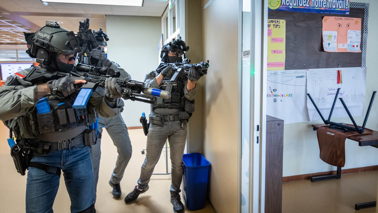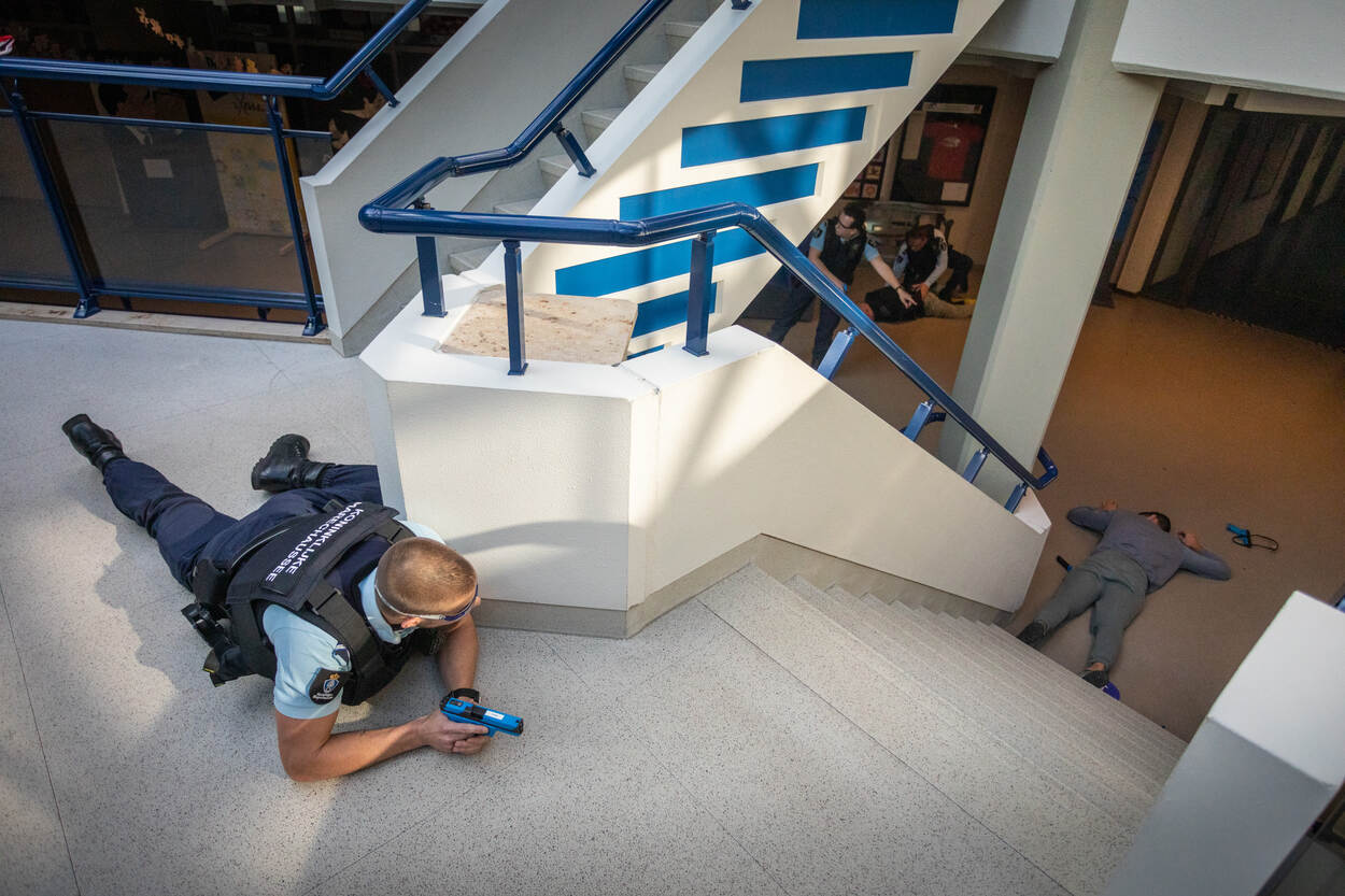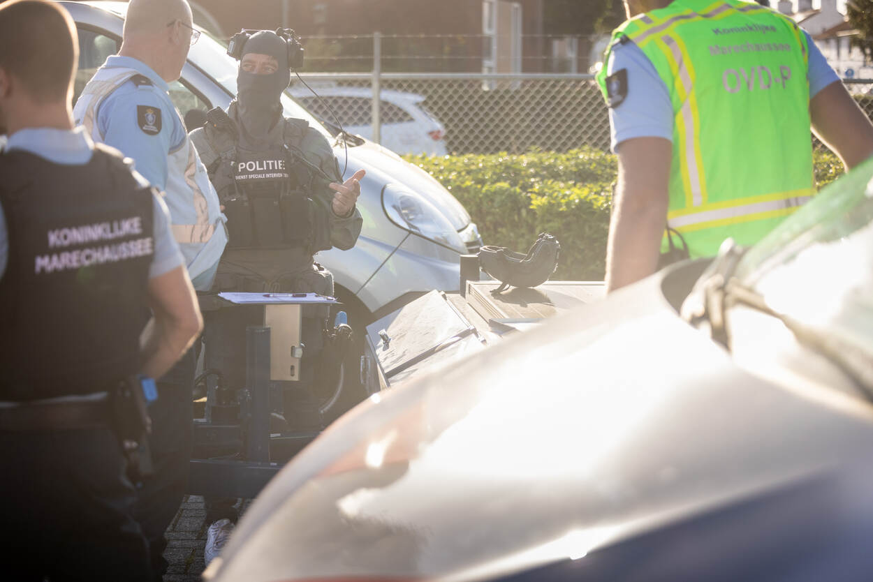 Voor de oefening krijgen de deelnemende eenheden oefenwapens en oefenmunitie uitgereikt. Ook de ‘schutters’ werden bewapend met oefenpatronen en oefenhandgranaten om het geheel zo realistisch mogelijk te maken. Voor de deelnemende eenheden moest het daardoor snel duidelijk worden dat ze met grof geweld te maken hadden en dat ze de situatie niet zelf konden afhandelen. Snel opschakelen zou essentieel zijn. Het begon allemaal op een rustige vrijdagmiddag op het politiebureau van Brunssum-Landgraaf. Daar werden de eenheden gebrieft over de oefening. Net als in het echt was het wachten tot de porto begon te 'rammelen'. De eenheden konden aan de bak toen de melding vanuit de meldkamer binnenkwam: ‘schutters op de AFNORTH International School’. Meerdere schutters gaan schietend door de school. Zij proberen zoveel mogelijk slachtoffers te maken. De mannen trekken verschillende vleugels van het gebouw in, wat de situatie extra ingewikkeld maakt voor de veiligheidsdiensten. “Attention, attention! We have a lockdown procedure.” De DBBO roept via de omroepinstallatie op de school om dat er schutters actief zijn. Ondertussen proberen de leerkrachten zoveel mogelijk in contact te blijven met de meldkamer van de school om te vertellen wat er om hen heen gebeurt. Zolang er nog geen patrouille van de KMar of politie ter plaatse is, is de DBBO van de school in de lead. De school bevindt zich op militair terrein, maar als de politie op dat moment dichterbij is dan de Marechaussee, gaan zij als eerste ter plaatse. Beide scenario’s werden beoefend. Marechaussees van de brigade Limburg-Zuid stormen het gebouw binnen om het geweld een halt toe te roepen, voor zover dat gaat. De later arriverende eenheden pakken de tweedelijnstaken op, zoals kruisingen afzetten en belangrijke partijen als de Recherche informeren. “Leg neer je wapen!” De marechaussees weten alvast een van de schutters neer te schieten en in de boeien te slaan. Maar de overige daders bieden zoveel weerstand dat ze in dekking moeten. De situatie wordt te gevaarlijk. Tijd om de DSI in te schakelen. Motorkapoverleg. Voordat de DSI het pand betreedt, zoeken ze eerst de Officier van Dienst (OvD) op om kort zaken af te stemmen. Wat is de actuele situatie? Waar bevinden zich de toegangen? Hoeveel schutters, leerkrachten en kinderen zijn nog binnen? Ook heeft de OvD een plattegrond van het gebouw bij zich. In dit geval geen overbodige luxe, want de school blijkt een waar doolhof. DSI’ers van het lokale Arrestatieteam Zuid, aangevuld met DSI’ers die opgeroepen zijn als Quick Reaction Force, betreden het pand. Een DSI’er geeft een collega van de Marechaussee een tikje op zijn rug: vanaf hier neemt de DSI de situatie over. De marechaussees bieden vanaf dit moment rugdekking. De DSI’ers gaan vanaf nu voorop. Lokaal voor lokaal zuiveren ze de betreffende vleugels van het gebouw. Zodra ze een leslokaal veilig hebben gesteld, neemt de KMar de beveiliging van die ruimte voor zijn rekening om die veilig te hóuden. Doelwit uitgeschakeld. Zodra de DSI’ ers zicht krijgen op een schutter, wordt die uitgeschakeld. De daders hebben hun kans gehad om zich over te geven. En last but not least de evaluatie. Wat zijn de lessons learned voor de toekomst? Oefenleider eerste luitenant Wino: “Na de eerste run hebben we ook al een korte bespreking gehad, zodat we de verbeterpunten meteen konden meenemen in de tweede run. We hebben zowel gekeken naar de technische aspecten als de samenwerking. Er zijn altijd zaken die aangescherpt kunnen worden, daar oefen je voor. Voor de eenheden was dit een mooie kans om te ervaren wat optreden in het hoogste geweldsspectrum met je doet. De deelnemers pakten het scenario heel serieus op. Dat was mooi om te zien. Verder vonden de deelnemende leerkrachten de oefening behoorlijk indrukwekkend. 'Nuttig om te trainen, maar hopelijk hoeven we het nooit mee te maken’, hoorde ik van hun kant. En zo is het.”