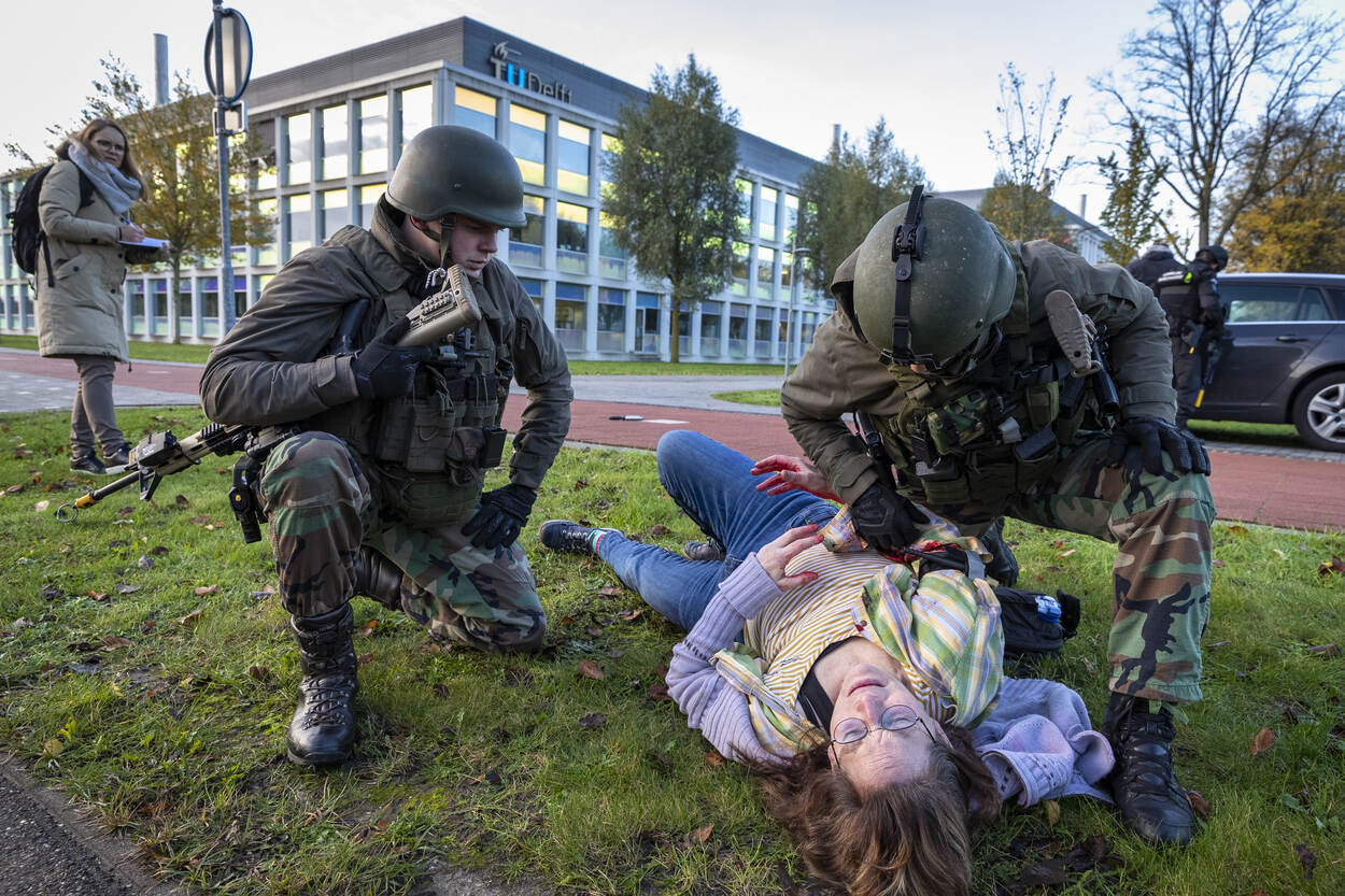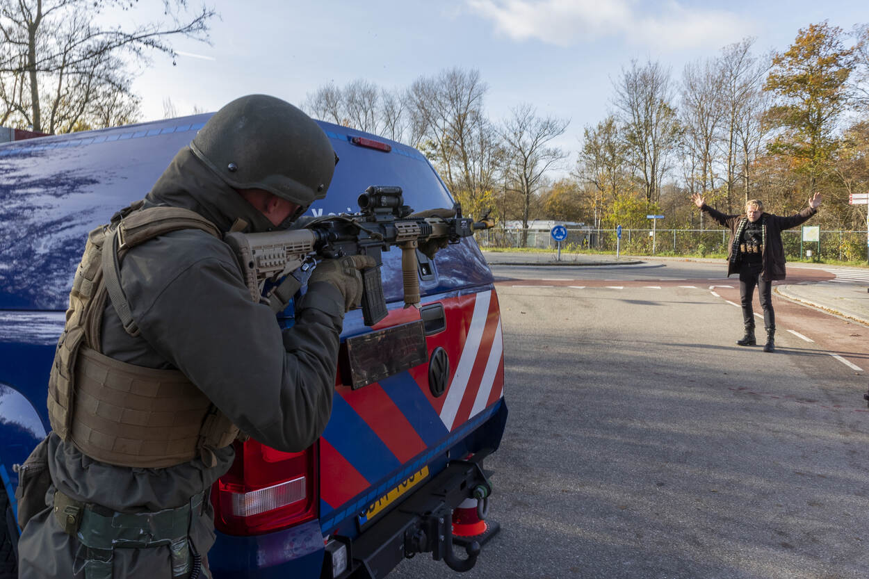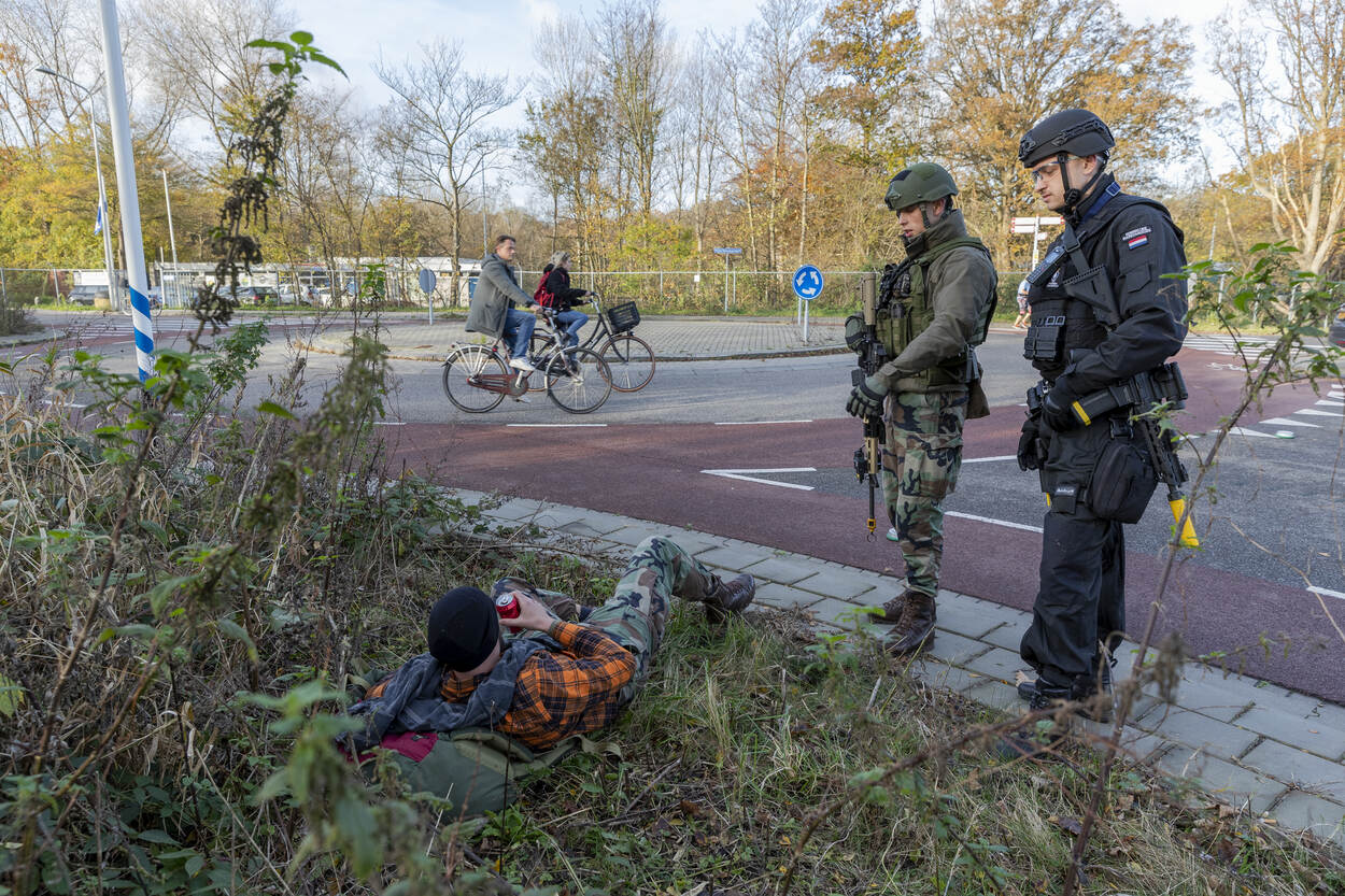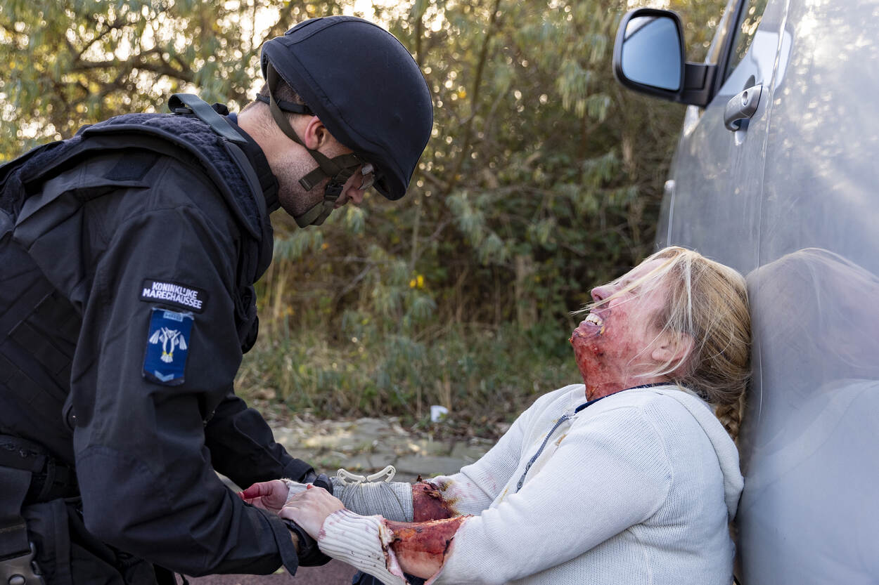 De trainingen vonden plaats in week 44 tot en met week 49. Elke week trainde een HRB-peloton met een eenheid van de Koninklijke Marine (1 keer) of de Koninklijke Landmacht (5 keer). De training bestond steeds uit 2 dagen. Dag 1 stond in het teken van opschaling vanuit Bewaken en Beveiligen en het gezamenlijk trainen van de skills en drills benodigd voor deze inzet. Op dag 2 werden de vaardigheden beoefend in een realistische omgeving en context. De oefening ARGUS vond plaats op 3 locaties. Bij het Reactor Instituut Delft (zie foto), bij het militair oefenterrein Waalsdorp in Den Haag en nabij het NATO Communications and Information Agency (NCIA), eveneens in Den Haag. De KMar en de mariniers hebben een zogeheten voertuigcontrolepunt ingericht bij de ingang van het Reactor Instituut Delft. Iedereen die het terrein wil betreden, moet zijn of haar identiteitsbewijs tonen. Het profilen van mensen is daarbij een belangrijk onderdeel. Wie bijzonder gedrag laat zien, kan aanvullende vragen verwachten. De eenheden hebben in de voorbereidingen volop getraind in het herkennen van afwijkende gedragingen. “Waarom staan jullie hier? Wat is er aan de hand?” Een journalist wil weten waarom de HRB en de mariniers het Reactor Instituut in Delft beveiligen. De HRB-operators beantwoorden enkele vragen en wijzen de interviewer daarna vakkundig door naar een persvoorlichter. Trainen in het publieke domein is ideaal. Behalve de acteurs die tot het scenario behoren, controleren de HRB’ers en mariniers ook alle werknemers van het Reactor Instituut. Net zoals dat in het echt zou gebeuren. Stilstaan of stilzitten in de buurt van het controlepunt is niet toegestaan bij verhoogde dreiging. Een dronken man die in het gras op zijn gemak een biertje wil drinken, wordt daarom vriendelijk doch dringend verzocht zijn vertier elders te zoeken. Hetzelfde geldt voor stilstaande auto’s nabij de ingang van het vitale object. Na het controleren van hun papieren, wordt ook hen gevraagd: “Kunt u alstublieft op een andere plek gaan staan?” Evalueren is essentieel. Hoe was de aanpak? Hoe kwam het over op de acteurs? De marechaussee en marinier bleven rustig tijdens de casus die op de foto wordt besproken. “Netjes afgehandeld” en “mooi opgelost”, luidde de conclusie. De HRB’ers en mariniers moeten ook alert zijn op incidenten rondom het voertuigcontrolepunt, zoals bij een plotseling conflict tussen een voorbij lopende man en vrouw. De man steekt de vrouw ineens neer. Hij wordt snel onder vuur genomen, overmeesterd en in de boeien geslagen. De neergestoken vrouw is tegen de vlakte gegaan. De eenheden verlenen rap de benodigde eerste hulp. Ondertussen kijkt IBT-instructeur adjudant Eric tevreden toe. “Jullie hebben adequaat gehandeld. Mijn complimenten”, evalueert hij na afloop. “Jullie hebben meteen een goede 360 weggezet en behielden het overzicht. Houd dit vast!” De eenheden moeten onder meer voorbereid zijn op een terroristische aanslag door een eenling, met één of enkele slachtoffers. Ook dit scenario werd beoefend. Gelukkig werd een naderend voertuig met daarin een terrorist met bomvest op tijd onderkend. In crisissituaties kan er van alles tegelijk gebeuren. Zo ontsnapt er uit de auto van de zelfmoordenaar een gegijzelde vrouw die gemarteld is en onder de brandwonden zit. Terwijl de ene collega de terrorist onder schot houdt, verzorgt een andere collega de zwaargewonde en getraumatiseerde vrouw. Teamwork in optima forma. De samenwerkende partijen hebben afgelopen jaren soortgelijke oefeningen georganiseerd, onder meer in samenwerking met de luchthavens Schiphol en Maastricht Aachen Airport. De evaluatiepunten uit die oefeningen waren meegenomen in de oefening ARGUS.