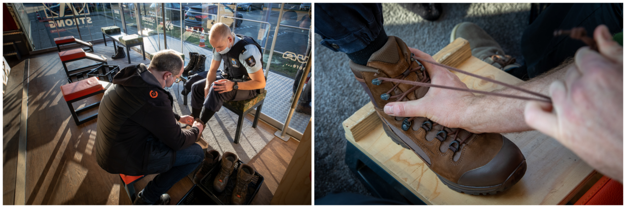 Tweede luitenant Gijs Boon, teamleider team 6 brigade Grensbewaking Schiphol: “Het is heel goed dat de Marechaussee het op deze manier aanpakt: modern en professioneel, inclusief de begeleiding door een medewerker van de leverancier. Als teamleider zit ik in principe op kantoor, maar ik ga elke dienst langs mijn groepen. Het betekent dat ik gemakkelijk de 10.000 stappen per dag haal en dat vraagt dus om goed schoeisel. Voor mijn oude kisten had ik een medische verklaring omdat ik wat problemen heb met de voeten. Mij zijn de Lowa Zepher en de Haix geadviseerd en ik ben benieuwd hoe dat gaat uitpakken.”