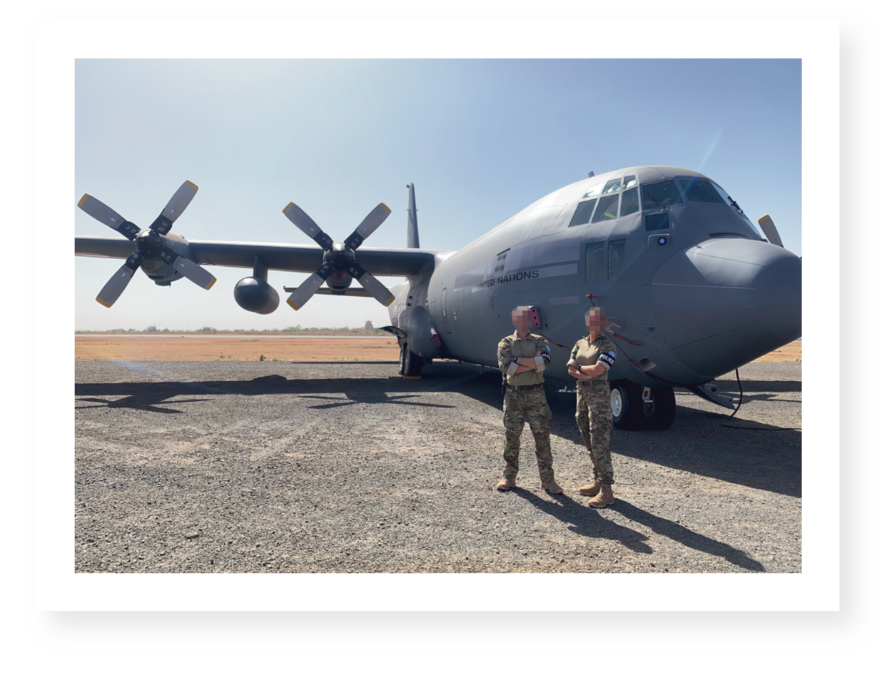 “Sinds november 2021 nemen wij (eerste luitenant Laura en opperwachtmeester Brandaan) als artikel 4-detachement deel aan de VN-missie MINUSMA in Mali. De Koninklijke Luchtmacht levert luchttransportcapaciteit aan de VN-missie met een Hercules C-130-vliegtuig en een detachement van ongeveer 85 militairen. De groep militairen bestaat vooral uit technisch personeel en Force Protection. Daarnaast zijn er ook nog crew-leden, staf en medisch personeel. De Nederlandse bijdrage aan de missie duurt in totaal 6 maanden. Na 3 maanden wordt er geroteerd en komt een nieuwe club ons aflossen.