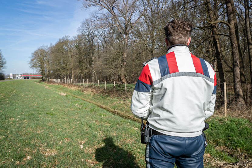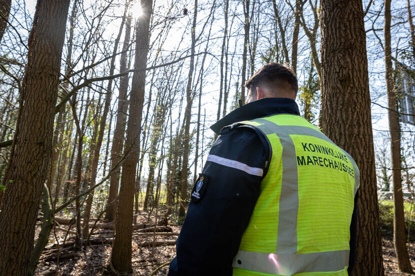 Thijs: “We besloten het bosperceel af te zetten. Inmiddels waren meerdere marechaussees en politieagenten ter plaatse gekomen om te assisteren. We hebben ze in koppels neergezet op strategische posities rondom het bos, dat best nog groot was. En dichtbegroeid. Ook hebben we een speurhond aangevraagd. De Landelijke Eenheid had een hondenbegeleider met speurhond beschikbaar die kon worden ingezet. Toen die eenmaal ter plaatse waren, trokken we op linie door het dichtbegroeide bos, achter de hondengeleider met hond aan.