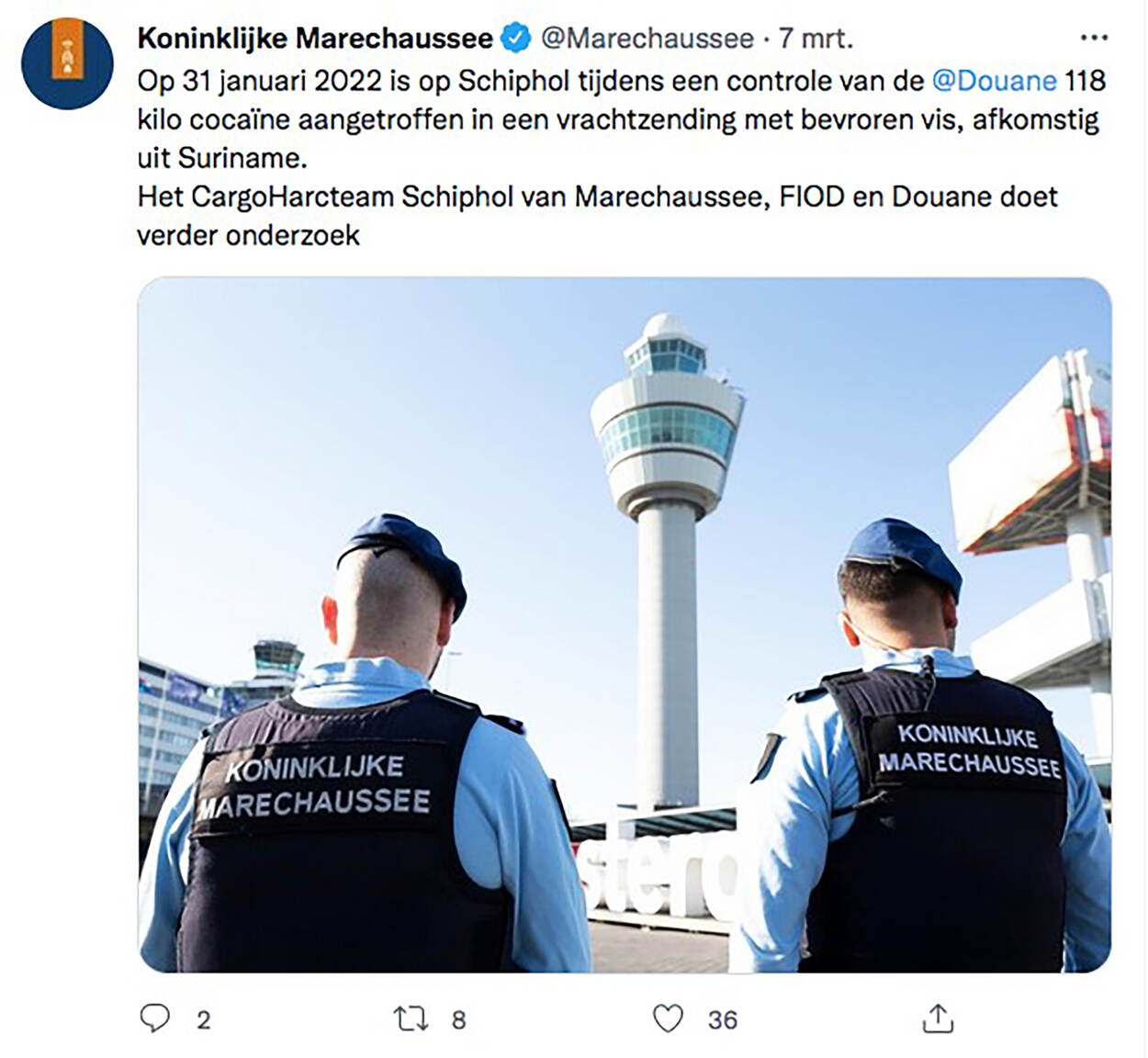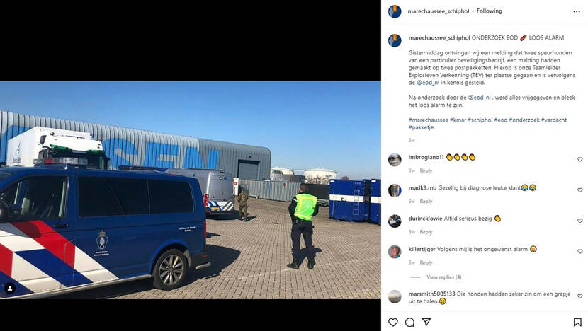Brigade Politie en Beveiliging Schiphol: “We ontvingen een melding dat 2 speurhonden van een particulier beveiligingsbedrijf, een melding hadden gemaakt op 2 postpakketten. Hierop is onze Teamleider Explosieven Verkenning (TEV) ter plaatse gegaan en is vervolgens de EOD in kennis gesteld. Na onderzoek door de EOD, werd alles vrijgegeven en bleek het loos alarm te zijn."