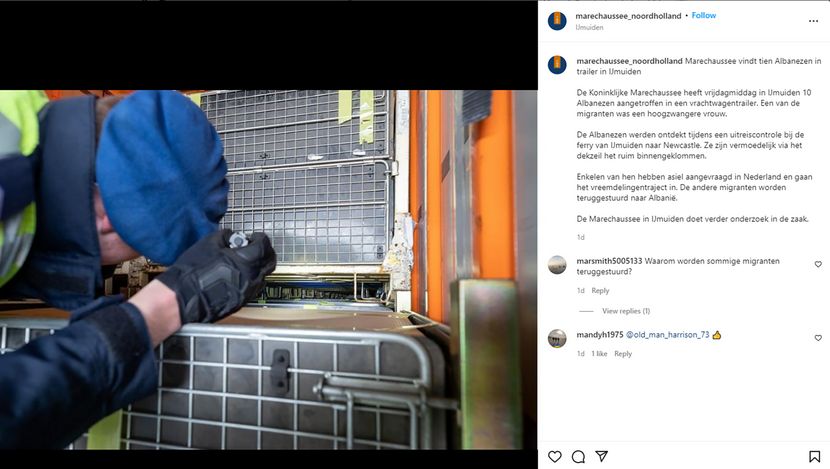 Brigade Noord-Holland: “De Koninklijke Marechaussee heeft in IJmuiden 10 Albanezen aangetroffen in een vrachtwagentrailer. Een van de migranten was een hoogzwangere vrouw. De Albanezen werden ontdekt tijdens een uitreiscontrole bij de ferry van IJmuiden naar Newcastle. Ze zijn vermoedelijk via het dekzeil het ruim binnengeklommen."